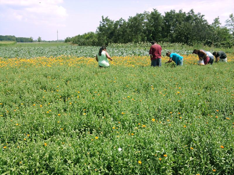 A körömvirág szedésének folyamata látható a képeken, mely már mindennapossá vált a területen. Az utolsó képen a máriatövis virágzás előtti állapotát lehet megfigyelni.