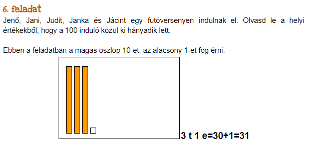 Leszámlálás még mindig, de rendezettebb formában, ami segíti az absztrakciót. A számolás is könnyen megy majd rajta és elég természetesen adódik a tízesével ugrálás, a kerek tízesekre pótlás is, hogy csak néhány előnyét említsük a tízes számrendszerrel való ismerkedés terén. A használatát olyan fontos problémák is indokolhatják, mint például autóversenyzők által megtett kanyarok számának összehasonlítása.