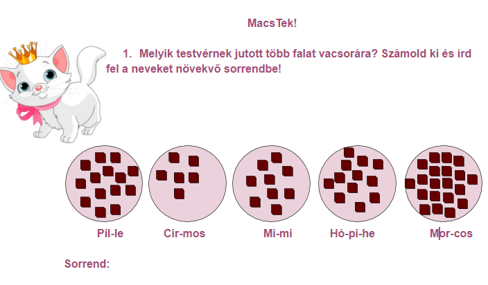 Ez az első lépés. Az eszközigénye nulla, bármit lehet számlálgatni, bár bizonyított tény, hogy kiscicákat, állateledeleket vagy királylányok cipőit sokkal izgalmasabb, mint sima köveket. Az, hogy kivel mennyi időt töltünk ezzel, gyerekfüggő, nem kell leragadni itt, de nem is érdemes ezen spórolni. A többféle csoportosítás például azon kívül, hogy segíti gyors leszámlálást, előkészíti a szorzás-osztás, az oszthatóság és a számrendszerek működésének megértését is.