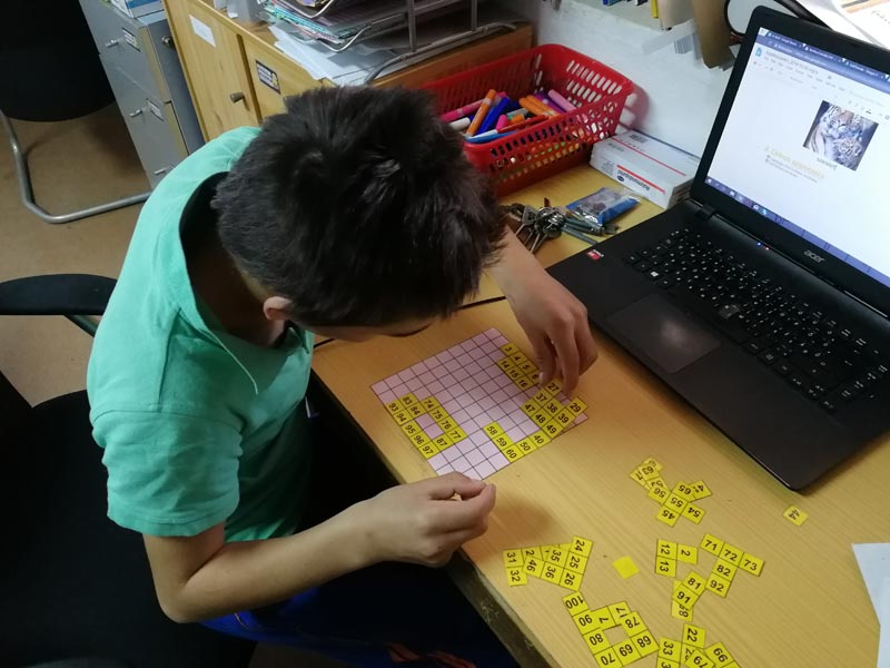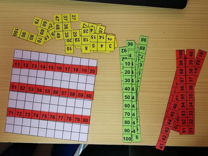 Ezt az eszközt szeretjük az egyik legjobban, mert nagyon sokféleképpen lehet használni. A számegyenessel ellentétben itt például egyben láthatjuk a számokat a százas számkörben. A számszomszédok közül a tízes szomszédok is jobban látszódnak, ráadásul a korábban említett analógiák felismerésére is remekül használható, könnyen lehet például tízesével ugrálni rajta és megfigyelni, hogy mi változik közben. Ezt az eszközt is többnyire egyben használjuk először, de csak azért, hogy aztán jöhessen a darabolás. Attól függően, hogy épp milyen összefüggést akarunk felfedezni, lehet sorokat, oszlopokat vagy tetszőleges formájú elemeket is használni. A téma persze itt sem mindegy, egészen különös lények, dolgok keverednek néha rá, mondjuk egy szörnyes vagy buszos foglalkozástervben.
