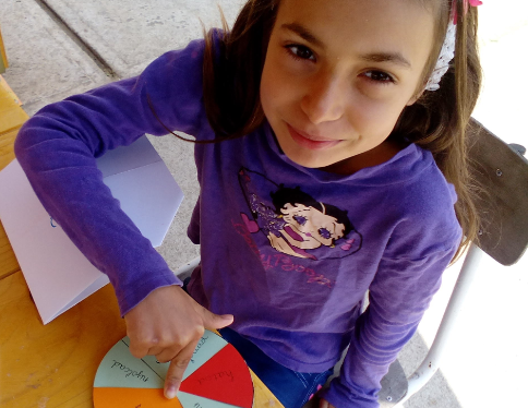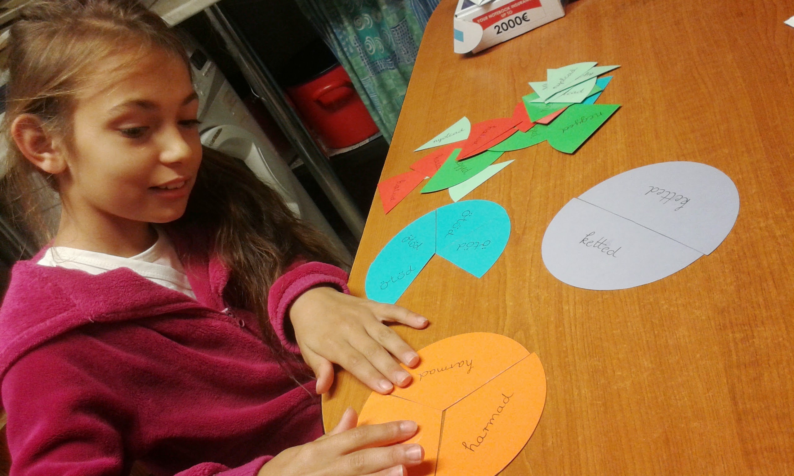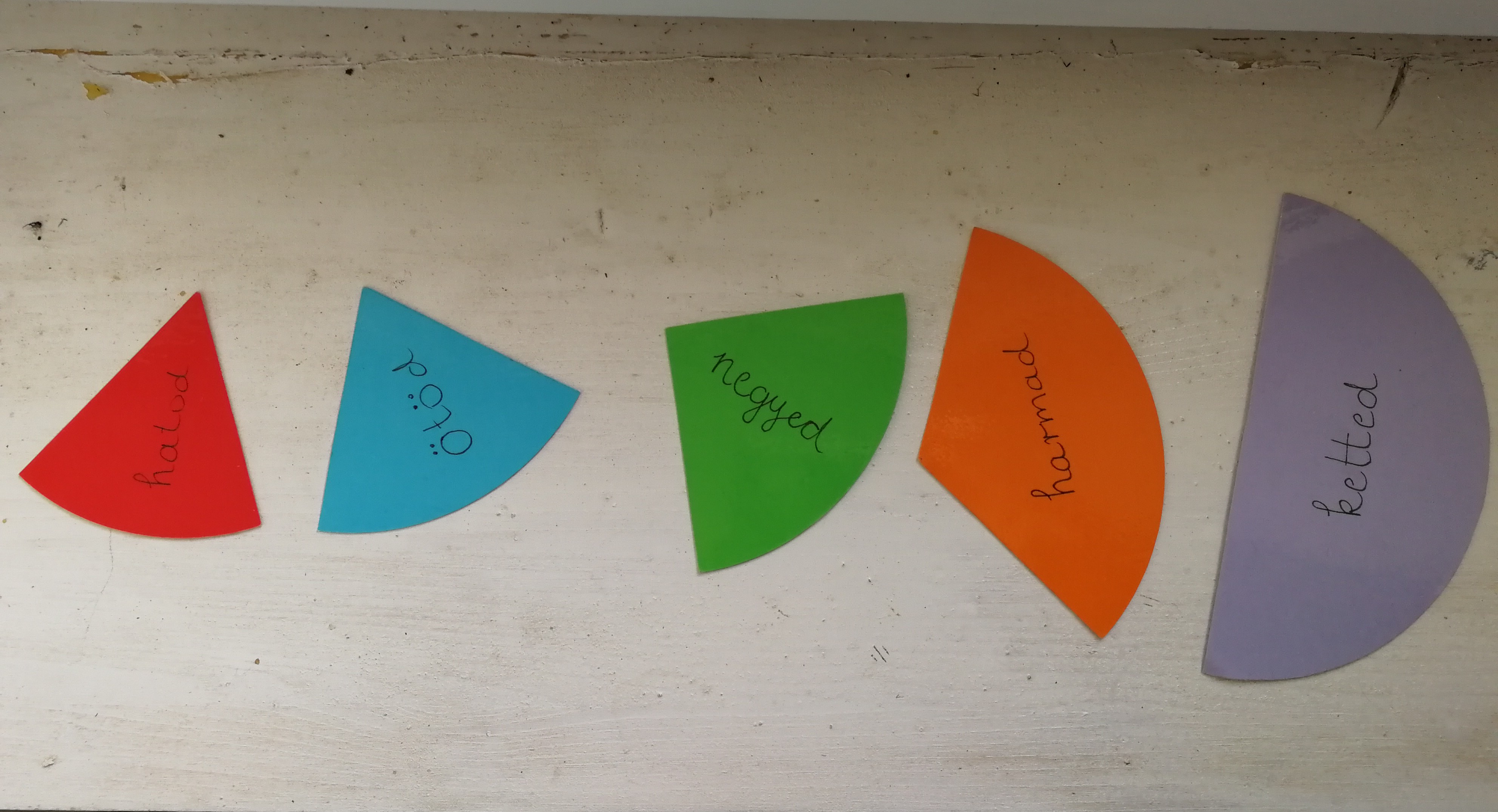 Nem nagy újítás, néhány tankönyvhöz eleve járnak egyenlő részekre osztott körök, nekünk saját készítésű, laminált példányunk van belőle. Többek közt az egyenlő részekre osztást, törtek kirakását, leolvasását, összehasonlítását, sorba rendezését is szoktuk gyakorolni vele. Előnye, hogy lehet pakolgatni, így nem csak a vizuálisan, hanem a mozgatáson keresztül is segíti a fogalom megértését.