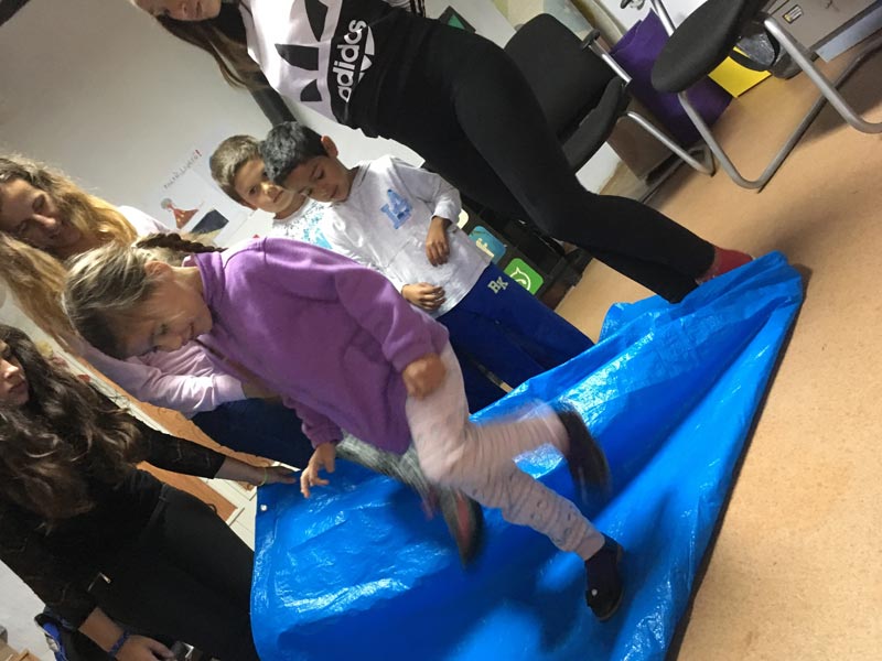 Titanic – avagy a süllyedő ponyva. Leterítettünk egy hatalmas kék ponyvát a tanoda padlójára, amire a gyerekek rögtön rá is léptek. Kérdezgettük őket, hogy mi lehet ez a kék izé, amire változatos válaszol érkeztek: medence, takaró, víz, szőnyeg…, de “valójában” egy hajó volt, ami csúnya léket kapott és süllyedt. Csak egyféleképpen lehetett megúszni a katasztrófát, ha sikerült megfordítaniuk maguk alatt a “hajót” úgy, hogy közben nem lépnek le róla. Volt olyan csoport, ahol sokan sokféle ötletet dobtak be. Ezeket az ötleteket mindig ki is próbáltuk. Jellemző volt, hogy azok vezették a kipróbálást is, akik az ötleteket hozták, tehát a vezető és az ötlethozó szerepek minden csoportnál összemosódtak – ezt a reflexiókban meg is piszkáltuk egy kicsit, beszélgettünk róla. Kiderült ugyanis, hogy a vezetők mindig azok, akik az aktuális tevékenységben ügyesebbek, több ötletük van stb. Vagyis mindig az adott tevékenység határozza meg a vezetőt: aki ügyes fociban, az vezet a foci közben, de nem jelenti azt, hogy egy ilyen ponyvaforgatós játékban is vezető lesz. Ez egy elég hasznos tanulsága volt az egész csapatépítésnek, hiszen úgy tűnik, hogy kisebbeknél (alsósok és felsőtagozat eleje) még nem a személyiség, hanem az adott tevékenységben való jártasság, ügyesség, vagy éppen a kreativitás alapján dobálgatják egymás közt a vezetői labdát. Ebben a játékban volt egyébként a legerősebb a reflexió is. A gyerekeket arra kértük, hogy mutassanak arra, aki a legtöbb ötletet hozta/aki vezetett stb. Sokszor az, akire mutattak megdöbbenve és megszeppenve fogadta ezt, de szemmel láthatóan nagyon is jól esett neki a többiektől ez a visszajelzés. Olyan is akadt, aki azt mondta, hogy ez csak most volt így, amúgy szerinte a csapatból egy másik lány sokkal többször vezet, mint ő. Ráadásul tudtak példákat is hozni. A reflexió mindenhol jelen van, mindenki képes rá. Jól kérdeztünk, jó eszközöket vittünk, ők meg nagyon őszinték voltak. És, hát róluk volt szó, ami azért mindig nagyon be tudja vonni a résztvevőket.