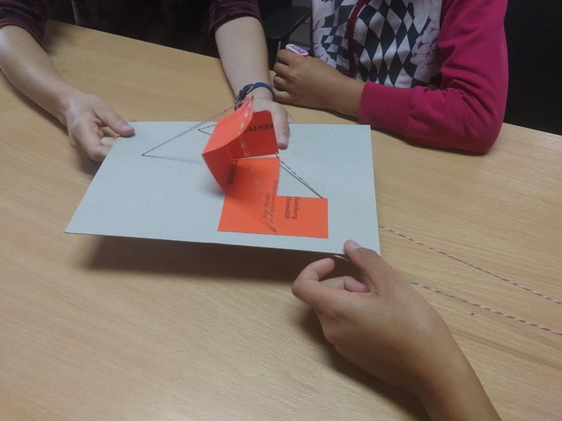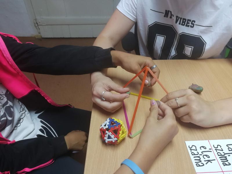 Egyes csoportokkal ezekből a számokból bizonyos következtetéseket is levontunk, amivel el is jutottunk Euler poliédertételéhez. Szintén nem minden csoportban a dualitással is foglalkozunk, sok-sok ujj, gyurma és egy kis képzelőerő segítségével kipróbáltuk, hogy melyik testnek melyik test a duálisa. Az utolsó feladatban a kocka került középpontba.