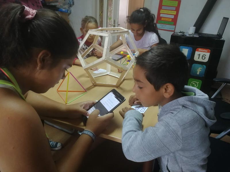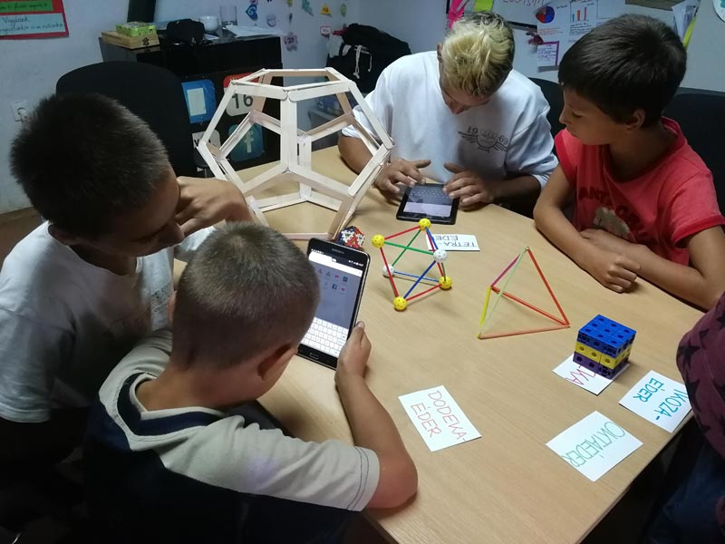 Az első feladat során rögtön magukra hagytuk a gyerekeket. Na, nem teljesen, ugyanis tablet segítségével kellett 5 percen belül kideríteniük, hogy az asztalon látható testeknek mi lehet a neve. Az idő átlépése nélkül minden csapatnak sikerült a helyes válaszokat megtalálni, majd azt is megfigyeltük, hogy vajon mitől szabályos egy szabályos test.