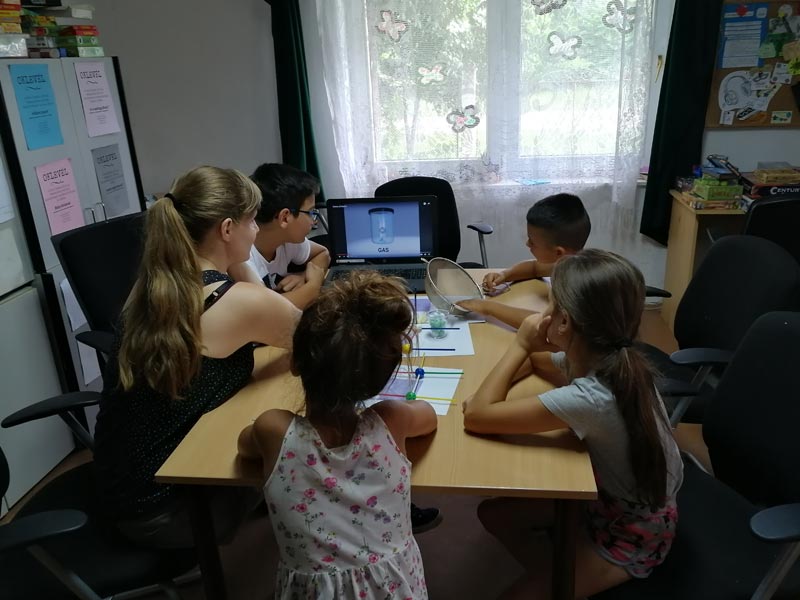 Ha halmazállapotok, akkor a halmazállapot-változásokat sem érdemes kihagyni, nem feledkeztünk meg róluk mi sem. Megbeszéltük, melyiket hogy hívják, és azokkal a csoportokkal, ahol nagy volt még az érdeklődés, egy szimulációval megnéztük, milyen változások mennek végbe ilyenkor az anyagokban. A szublimációt és lecsapódást egy kísérleten néztük meg közelebbről.