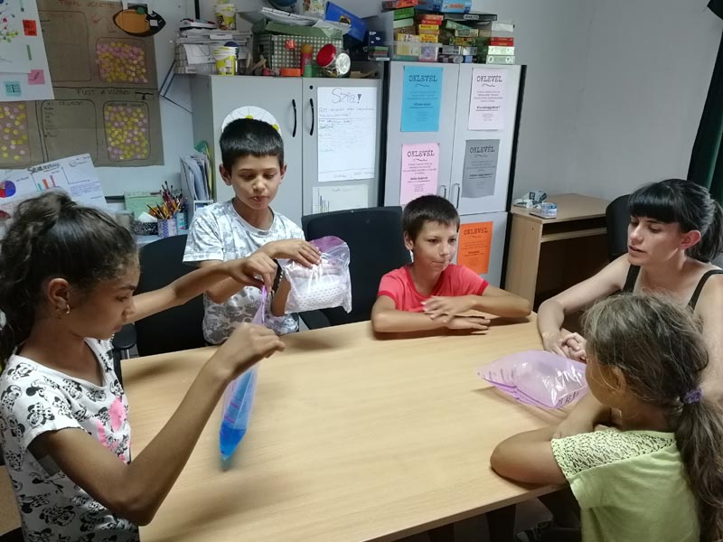 A tanodába érkező tudóscsoportok először három zacskóba zárt anyaggal találkoztak, és miután kitalálták, hogy vizet, jeget illetve levegőt rejtettünk bele, különféle tulajdonságukat is megfigyelték, például a keménységüket, hőmérsékletüket, színüket. Na meg persze a halmazállapotukat is, ha már ez a téma. Ezután jöhetett annak vizsgálata, hogy vajon az alajuk és a térfogatuk állandó-e vagy változik. Különféle formájú edényekbe öntöttük át az anyagokat – igen, a levegőt is, amit természetesen a gyerekek elég kétkedve fogadtak. Ebből a hitetlenkedésből kiindulva remek beszélgetések indultak el annak kapcsán, hogy hova tűnik a levegő, mit történhet vele és egyáltalán miből is állhat.