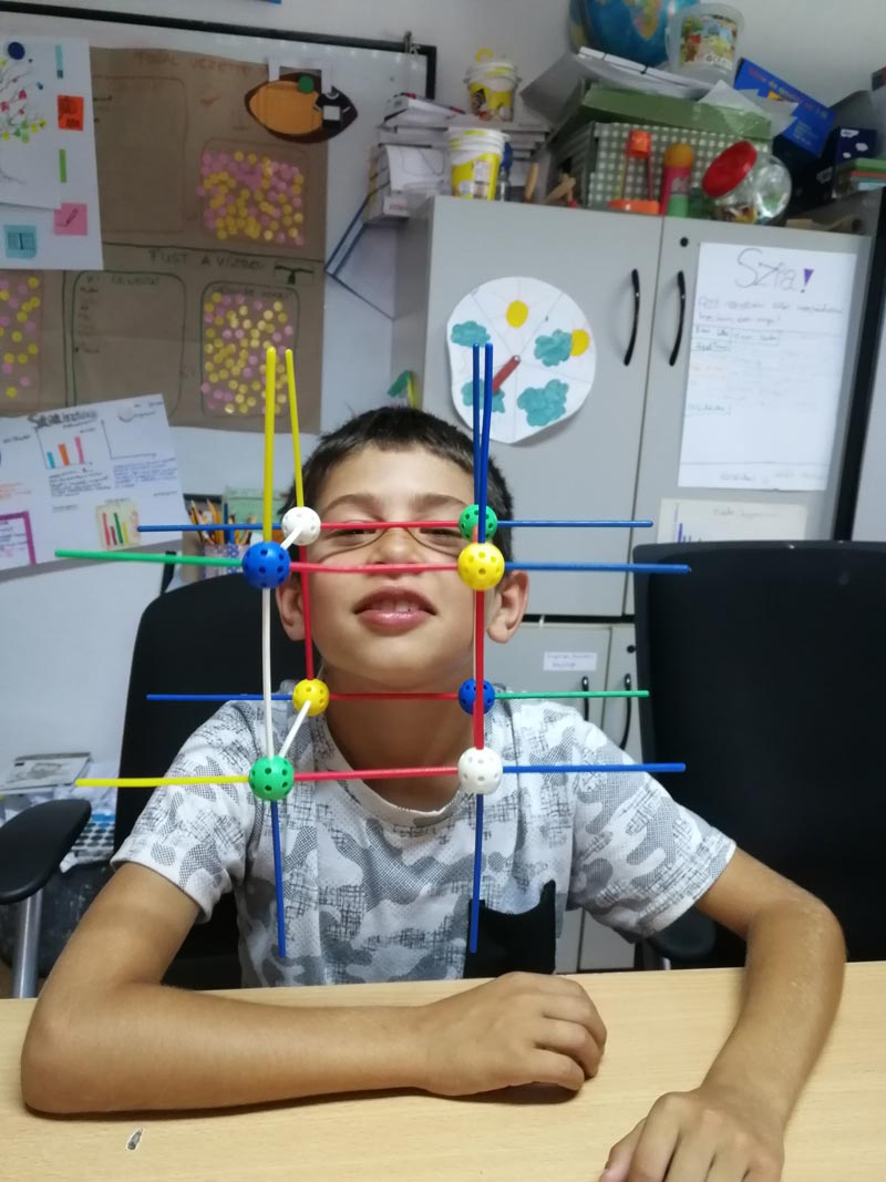 Ezzel meg is érkeztünk az egyik legfontosabb kérdésünkhöz: miből állnak az anyagok? Ha például belemennénk a víz belsejébe, mit látnánk? – Akkor megfulladnánk. Halakat. Semmit. Ugyanolyan vizet, csak kisebbek lennénk. – Jöttek a válaszok, amik mindegyike egy kicsit elárulta, hogy milyen anyagszemlélet él a gyerekek fejében. Hogy ez a kérdés ne maradjon nyitva, és hogy a részecskeképpel ismerkedni kezdjünk, egy videó segítségével utána is jártunk a válasznak. Ezután modellekkel vizsgáltuk meg, hogy a különböző halmazállapotokban milyen lehet az anyagok szerkezete. Papírgalacsinokat reptettünk hajszárítóval, üveggolyókat öntöttünk át egyik pohárból a másikba, Babylon készletből pedig kristályrácsot építettünk. Ez utóbbi a projekt hátralévő részében fejdíszként is remekül megállta a helyét.