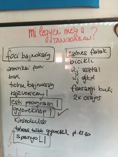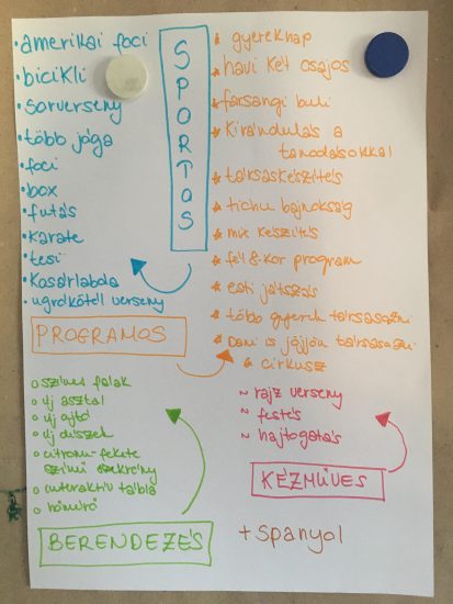 Folytattuk a kedden elkezdett ötletelést a disputás csapatunkkal arról, hogy milyen programok, változások legyenek a tanodában. Egy gyors köteles játékkal ráhangolódtunk a foglalkozásra és egymásra, majd jött a nagy tanoda sztori mesélés, a kezdetektől. Mindenki hozzátett egy kis darabot, amire ő emlékezett, tetszett neki, de persze mi is segítettünk, mert hát 2012, amikor ez az egész elkezdődött Toldon, nem tegnap volt. Nagyon jó volt, ahogy szépen lassan előhívódtak a régi emlékek. És az is, hogy ezt mind velük együtt éltük meg az évek során. Egy gyors, izgis és egyben frissítő sárkány-királyfi játék után bele is vágtunk, hogy a tanoda működésre tett rengeteg javaslatukból kiscsoportban készüljön egy tízes lista. Annak alapján kellett döntést hozniuk, hogy melyek azok a javaslatok, amiknek a megvalósulását nagyon szeretnék. Két csoportban dolgoztak, majd a listák megosztásakor kiderült, hogy mind a tízes lista, mind az első három helyen szereplő javaslatok között is vannak egyezések. Szóval nagy eséllyel kerülnek majd megvalósításra ezek a változtatások. Utána még beszéltünk egy kicsit arról, hogy mi is az az érdekképviselet – bevonják a többieket is, valamint jelzik a többiektől érkező javaslatokat felénk. Mintha alakulna ez a tanoda önkormányzat… Nagyon lelkesek, a végén pedig egy fő kivételével (aki csak tag szeretne lenni) mindenki úgy nyilatkozott, hogy tevékenyen szeretne majd benne részt venni. Remek az is, hogy itt a nyár, lehet folytatni, kialakítani, hogy ősszel tényleg bele is tudjunk vágni a TÖK-be, vagyis a Tanoda Önkormányzatba.