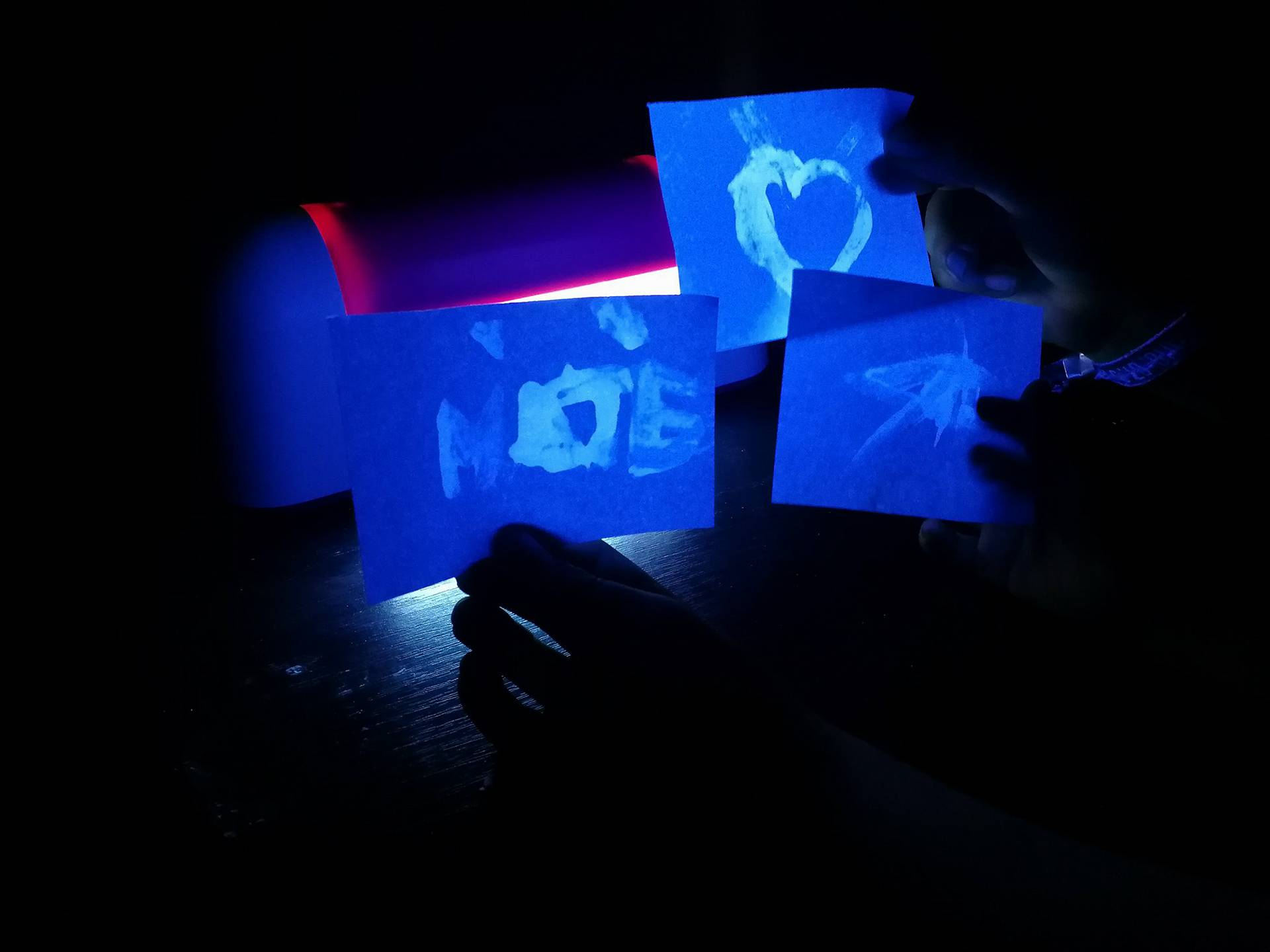 Délután a kultúr egy része teljesen elsötétült, de csak azért, hogy UV-fénnyel kísérletezhessünk az érdeklődő gyerekekkel. A labort a színpadon rendeztük be, ahova a tudósok kis csoportokban érkeztek. Belépés előtt egy átlátszónak tűnő körömlakkal mindenki írt egy kis üzenetet, ami bent, az UV-lámpa segítségével láthatóvá vált. A felfedezés nyomán aztán tovább folytattuk a vizsgálódást, és megnéztük a ruháinkat, a körömlakkot, egy tonikot illetve egy ezrest is, hogy hogyan viselkedik UV-fényben. Jelentjük, a tonik kék lett, az ezresünk pedig nem volt hamis! Végül a tonik és némi keményítő segítségével nemnewtoni masszát készítettünk, ami egyrészt egy kicsit más színűvé vált a lámpa fényénél, másrészt furcsa módon néha folyadékként, néha viszont szilárd anyagként viselkedett. Megütögettük, tapogattuk, szétnyomtuk, összegyűjtöttük, megcsodáltuk – így ért véget a mai villámkísérletünk, amit a 3-16 éves korú tudósaink mindegyike élvezett.