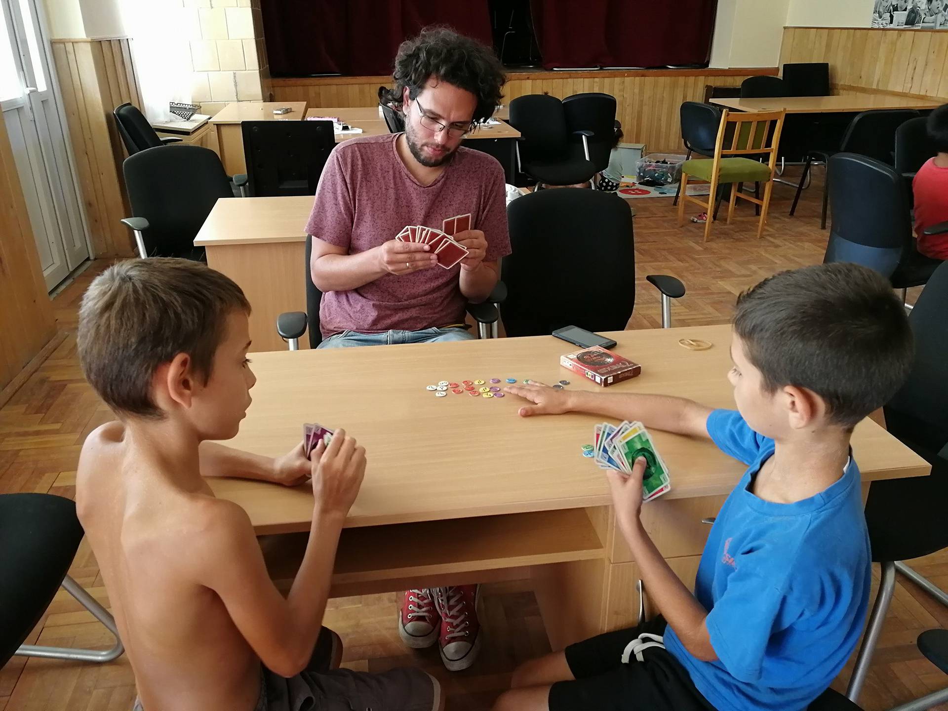 Már megint úgy alakult, hogy a legjellemzőbb tevékenységről alig írtunk. Igen, teljesen hétköznapi lett a társasjátékozás, gyakran bele sem gondolunk, hogy mennyire fontos eleme a táborainknak, hiszen rengeteg gyereket köt le és közben tudjuk, hogy milyen izgalmas dolgok mennek végbe bennük. Csak pár történet máról. Két leendő ötödikessel játszottuk a 7 Signum című kártyajátékot, ami egy Rikikihez hasonló ütésvivős játék, de nem is ez a lényeg. Lassan állt össze nekik, hogy mit is kellene csinálni, pedig gyakorlott társasosok. Mínusz tíz, tizenöt pontos körökkel kezdtek, majd három-négy körrel később már megúszták mínusz pontok nélkül, tehát tökéletes kört produkáltak. Figyeltek, értelmeztek, végül húsz perc alatt megfejtették a játék alapjait, anélkül, hogy mi elmagyaráztuk volna. Valami ilyesmi a társasjáték-pedagógia lényege. De felemelő volt az is, amikor két nagyobb lány a Kanagawával a kezükben megkérdezték, hogy lehet-e ketten játszani, szóval nélkülünk. Pedig az azért nem egy faék egyszerűségű játék. És leültek és kipakolták és megpróbálták. Végül nem jött össze, beletört a bicskájuk, de ez ettől még egy értékes történet. Főleg, hogy egy könnyebb, ismertebb játékot (Hick Hack) előtte már lejátszottak nélkülünk. Délután egyébként kevés önkéntes volt, így mások is önállóságra kényszerültek. Egy ötödikes fiú két kisebb társát vezette keresztül egy Fünf Gurken és egy No Thanks partin, amik fél szemmel követve nagyon is rendben voltak.