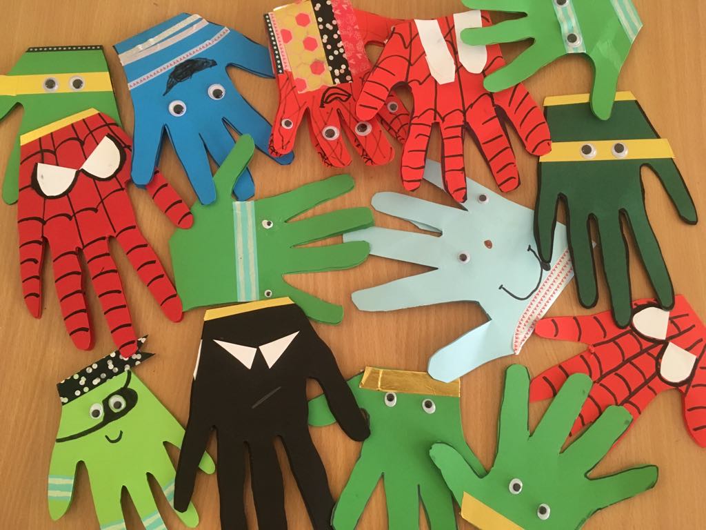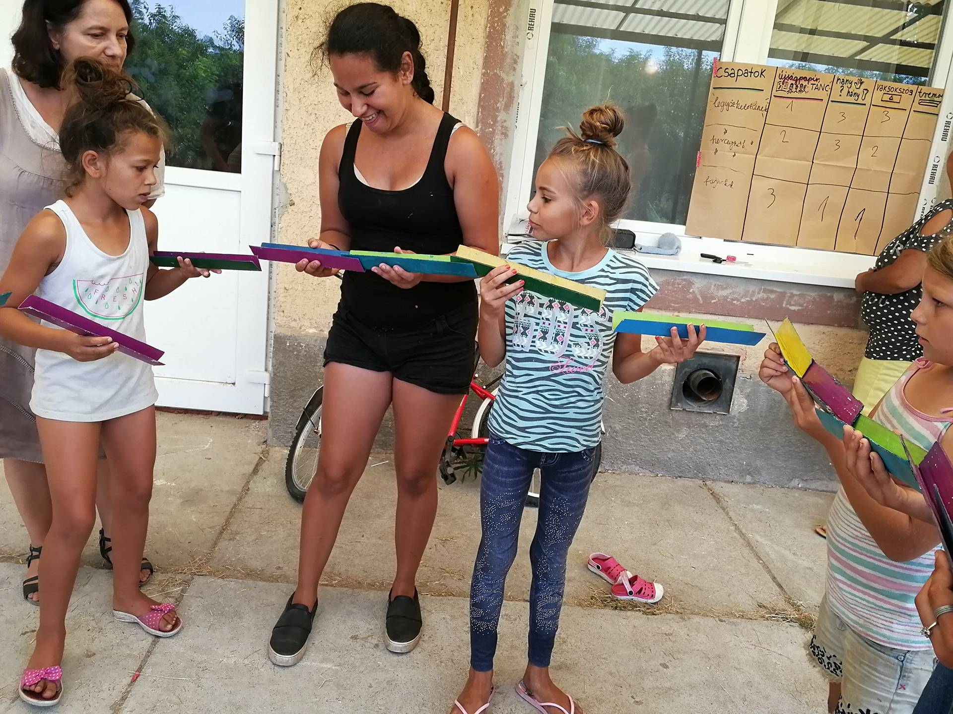 Ezalatt a nagyobbak a kultúrházban tevékenykedtek. A harmadik tábor sem maradt szuperhősök nélkül, hiszen a mai kézműves programon a gyerekek szuperhős témában készítettek képeslapokat. Először körberajzolták a kezüket, kivágták, majd díszítették dekor tapasszal, szemekkel, filcekkel, mintákkal. Elég sok gyereket érdekelt és lekötött a program, volt, aki többet is készített és vitte haza a képeslapokat anyunak, apunak, tesónak, de az önkéntesek is kaptak kedves üzenetekkel ellátott pókembereket, batmaneket.