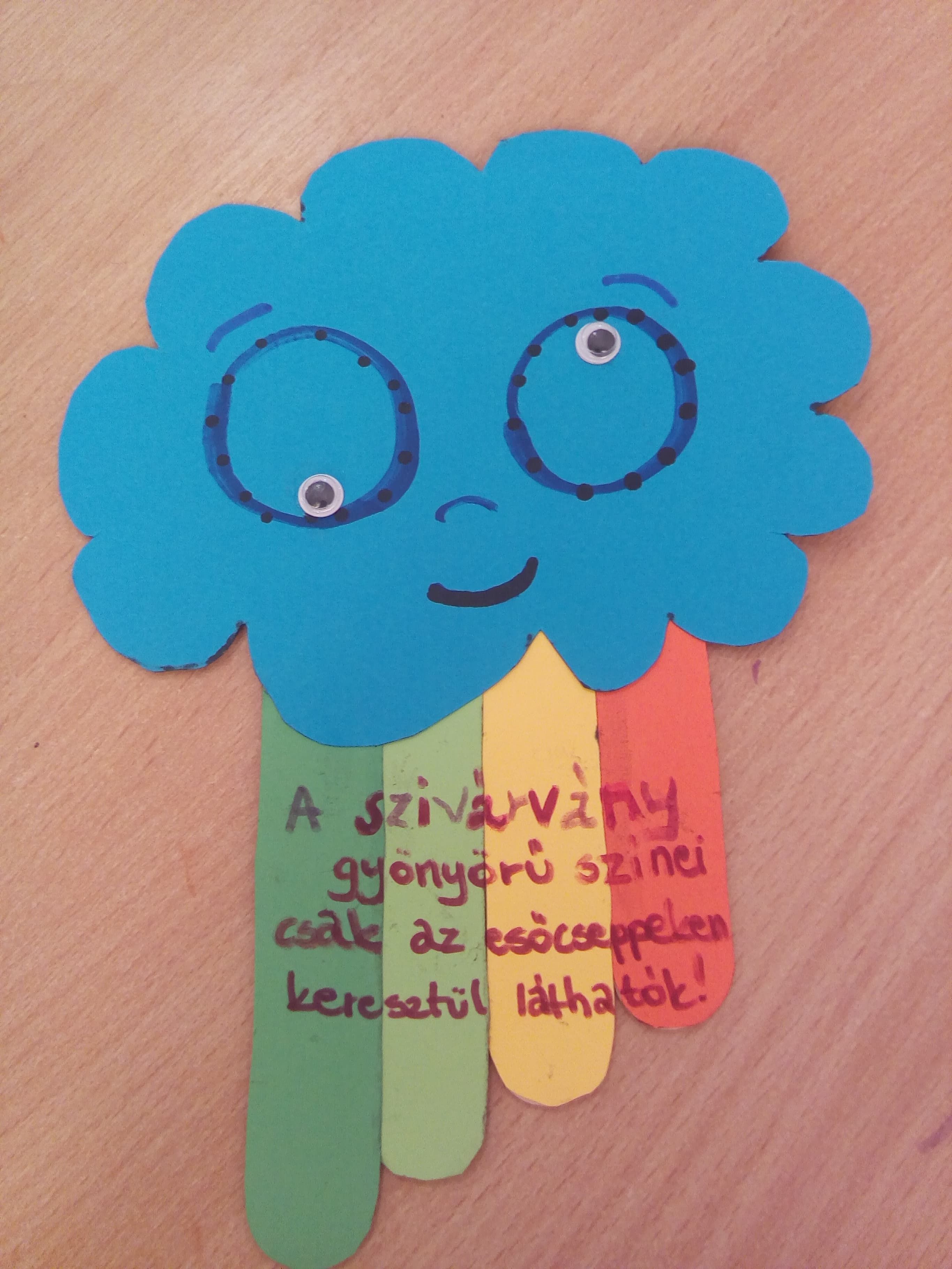 Rendhagyó módon egy délutáni, harmadik kézművessel is készültünk. A tikkasztó melegben mindenki a hűsítő záporra vár Toldon, s persze a nyári zápor dísze a szivárvány. Eső híján, mi papírból alkottunk szivárványokat spatulák segítségével. Az elkészítése egyszerű volt, csak rajzolás, vágás és ragasztás, de hogy feldobjuk a műveket, hozzáillő idézeteket kerestünk az interneten és különféle betűtípusokkal írtuk fel azokat. A természettudós programmal párhuzamosan futó alkotó tevékenységre csak néhány lézengő tartott igényt, de velük kellemesen lehetett dolgozni és kicsit beszélgetni is.