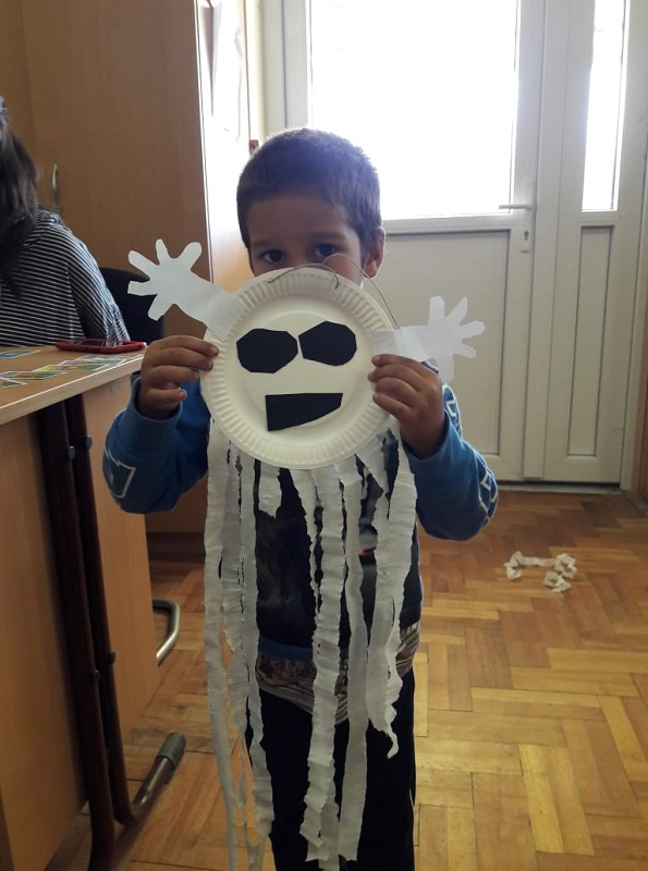 A falevelek után szellemeket is készítettünk papírból, hogy holnap este legyen mivel ijesztgetni egymást. Bár az elkészült remekek egy része a gyerekek szerint inkább szomorú lett, mint rémisztő, azért a legtöbben elégedettek voltak a munkájukkal.