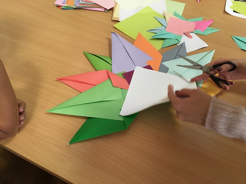 A reggelt egy régi-új kézművessel kezdtük; hajtogattunk. Az őszre való tekintettel faleveleket. De ezt sem apróztuk el, szó szerint. A valósághoz képest többszörös méretű, színes juharfaleveleket készítettünk. Kezdetben csak hárman hajtogattunk, aztán már heten, nyolcan folytattuk. Páran még filccel is díszítették a szivárvány színű leveleket.