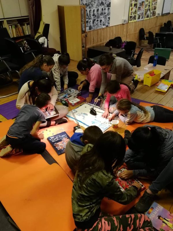 És persze folytattuk a tegnap elkezdett 1000 darabos puzzle-t is, a délelőtt és a délután végén is raktunk hozzá nem is keveset. Nagyon sokan megfordultak ma a kép körül, és kisebb kupacokba tömörülve meglepően türelmesen keresgélték az összepasszoló darabokat. Persze a neheze még hátra van, izgulunk is kicsit, de egyelőre nem csappan a lelkesedés, sőt voltak, akiket alig lehetett elküldeni mellőle a nap végén.