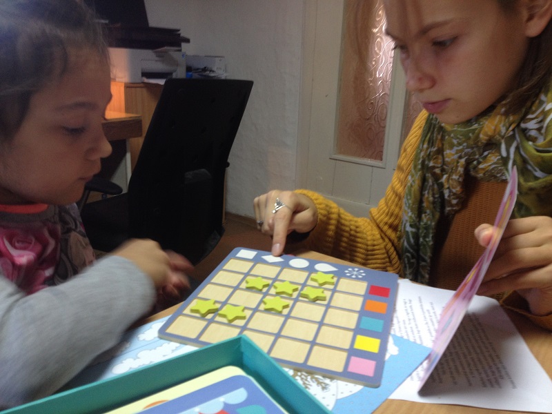 Ezeket a mátrix játékokat pedig azért szeretjük, mert amellett, hogy ebben az esetben pl. a szín és a formafelismerést fejlesztik, de közben egy nem egyszerű rendszerben kell tájékozódni oszlopok és sorok között, ami kezdetben nehéz, de néhány alkalom után szuperül látszik vele a fejlődés a gyerekeken. És ami pluszban jó, hogy önállóan is használható, mert a megoldást a gyerek megtalálja a kép hátoldalán. Persze, egyelőre még nem itt tartunk.