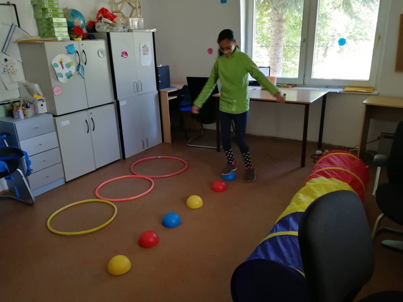 Beszereztünk hát néhány nagymozgást fejlesztő eszközt. Ki hány félgömbön tud végigmenni anélkül, hogy letegye a lábát?