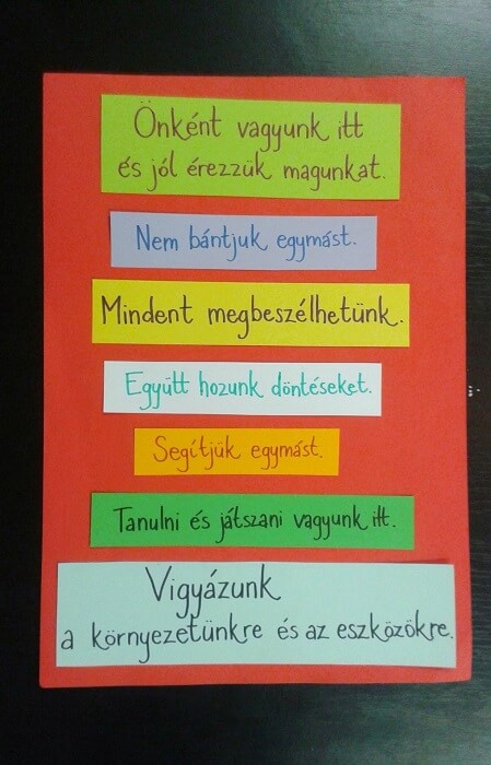 Arra gondoltunk, hogy segítene, ha minden alkalom elején szó esne arról, hogy milyen szabályaink vannak. Ha előre tudnák a gyerekek, hogy mihez alkalmazkodjanak, hogy mi az, amiért szólni fogunk, amiért szólhatnak egymásnak vagy nekünk is, mik azok, amiknek a betartását kérjünk egymástól és magunktól is. Ezeket persze ezelőtt is tudta mindenki, mégis teljesen más az, amikor egy adott helyzetben, nagy hangzavarban, felfokozott állapotban hozzunk elő egyet-egyet, és az, ha már a belépésnél foglalkozunk velük. A szabályok felelevenítéséhez a házirendre esett a választásunk, amit még régen az akkor legidősebb tanodásainkkal raktunk össze.