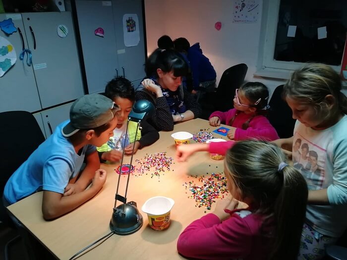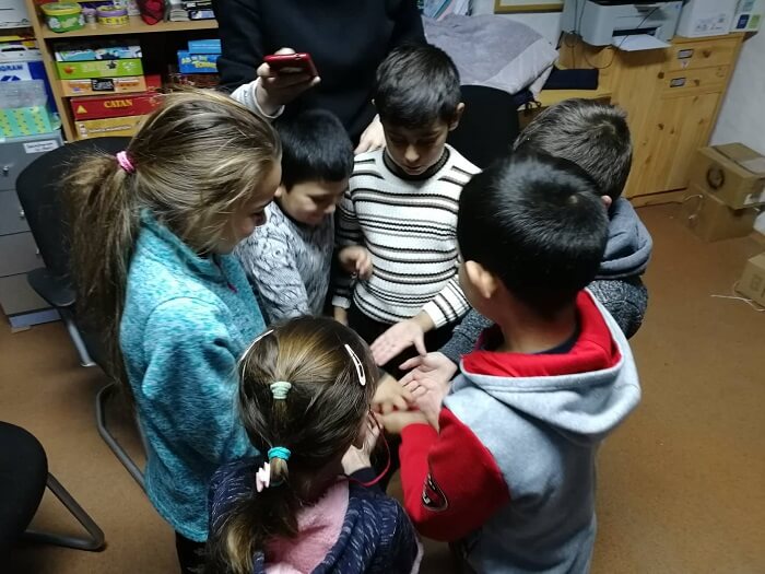 Korábban kevés olyan foglalkozás volt, ami csak az alsósokat érintette, ráadásul mindenkit egyszerre. A táborokban, az esti közös programokon kistesók, nagytesók, akár a szülők is ott voltak, gyakran keveredtek a korosztályok, most viszont épp az volt a cél, hogy ők legyenek a főszerepben. Így bár nem is olyan meglepő, minket felkészületlenül ért az a hihetetlen nyüzsgés és energia, amivel a gyerekek erre reagáltak. Gyakran annyira nagy volt a hangerő, hogy nemhogy egymást nem hallották, de minket sem. Nehéz volt leülni, egy helyben maradni, figyelni bármire, mindig történt valami izgalmas, amihez mindenki jó hangosan odaszaladhatott. Nem az érdeklődés hiányzott, nem az volt a gond, hogy nem nekik való dolgokkal készültünk, mégis nehezen tudtak megvalósulni a programok, az alkalom végére pedig nagyon elfáradtak ők is, mi is. A második félévben kétfelé bontottuk őket, kevesebben jöttek egyszerre, de ez sem hozott jelentős változást.