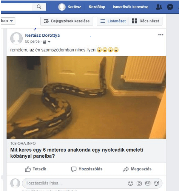 Az egyéni foglalkozások alkalmával megoldott feladatlapok egyik legnagyobb tanulsága az volt, hogy bár a hír elolvasása után a rövid nyomozást mindenki elvégezte, az ennek során szerzett információkból sokan nehezen tudtak következtetést levonni a hír hitelességét illetően. Az első, Facebook-on megosztott hír például arról számolt be, hogy egy hatméteres anakondát találtak egy kőbányai ház 8. emeleti lakásában. Ez a hír az álhírek álhíre volt: egy minden szempontból gyanúsnak tűnő híroldalon találtuk, ahol egy évekkel korábban, a világ messzi szegletén készített videót mellékeltek a cikkhez.