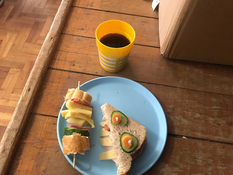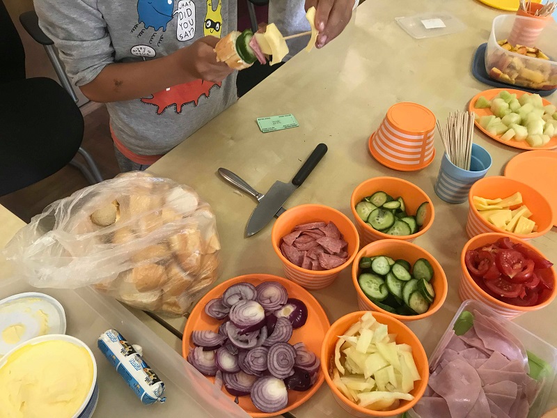 Aztán megalakult a SzuperSzendvicsSzakácsok cég is, és a név adta magát, szuper szendvicseket csináltunk. De nem ám csak egymásra pakolt finomságokat kell elképzelni, hanem kinyújtott nyelvű szörnyszendvicseket és édes, gyümölcsös állatkákat. A hét elején kissé nehezen indult a gondolkodás és az alapötlet megtalálása, így segítségünkre hívtuk az internetet, ahol már könnyen tudtunk keresni és válogatni a sokmindenség közül. Kicseréltünk egy-két hozzávalót, összeírtuk az alapanyagokat, dekorációt és tálalást terveztünk, majd a csapatkapitánnyal a boltba is elmentünk. A folyamat közben alapvetően sok külső segítségre, támogatásra, rendszerezésre volt szükségük a gyerekeknek, nehezen indultak be, de amint megvoltak a konkrét feladatok és felelősök, már gördülékenyebb volt a munka és egyre több saját ötletet is behoztak. Így lett például virág az asztal közepén vagy pöttyös papírterítőnk is. A szuper szakácsok voltak életkorban a legkisebbek (a csapatkapitányt leszámítva), de végig nagy lelkesedéssel és aktívan vettek részt a projektben. Vasárnap pedig hihetetlen ügyesek voltak a szendvicsek elkészítésében és a séró belövése után eladóként is remekül beváltak.