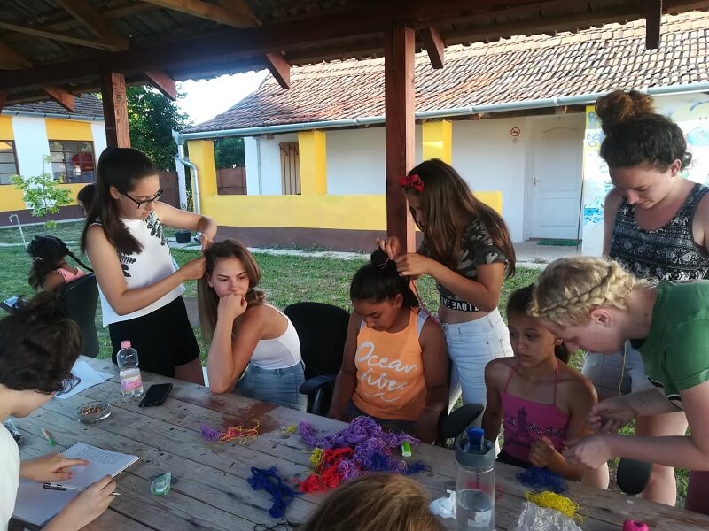 A csajos klub fő tevékenysége a hajfonás volt. Az alapötlet az évközben tanuláskor gyakran feltett “megcsinálhatom a hajad?” kérdésből indult. Arra gondoltunk, hogy a csajos klub megfelelő alkalom lenne az ilyen fajta igények kielégítésére. Vittünk sok hajgumit, fonalat és tableteket. Voltak, akik hamar megtalálták a helyüket a programban, ők egyből nekiláttak a különböző frizurák elkészítéséhez, vagy éppen ők voltak a megrendelők és a hajkészítés alanyai. De voltak, akik azt mondták, hogy nem tudnak hajat fonni és azt sem szeretnék, ha befonnánk a övéket. Ez utóbbi csoport idővel feltalálta magát és a hajba készített fonalakból kezdtek el különböző technikával karkötőt készíteni maguknak és másoknak.