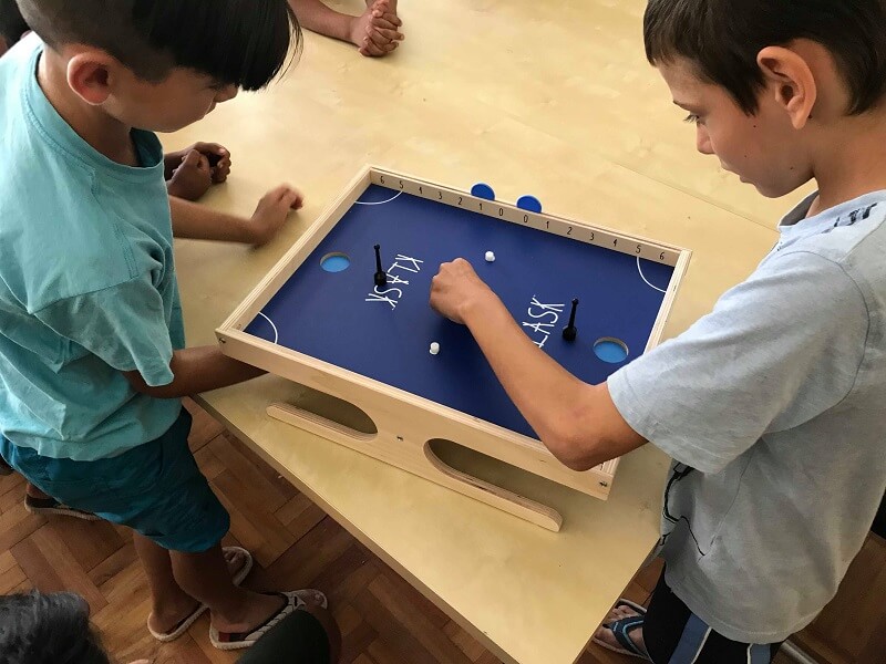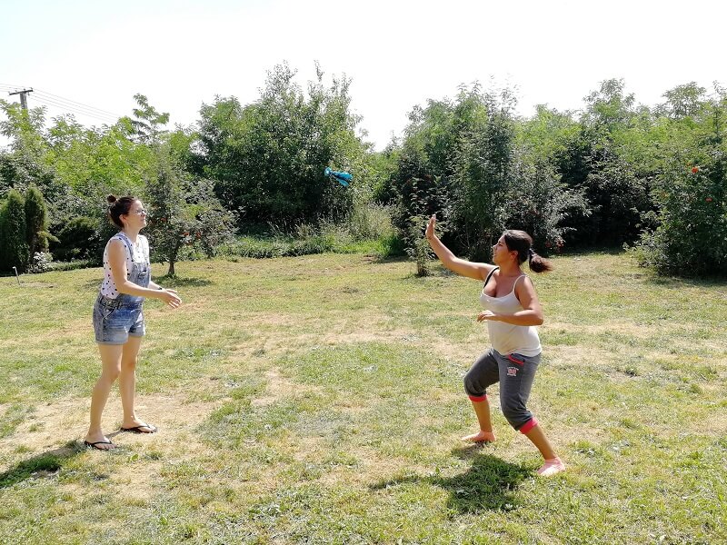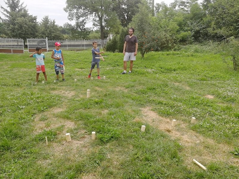 A második táborban néhány új sportot is kipróbáltunk, amik igen nagy népszerűségnek örvendtek az egész hét során. Ilyen volt például a Klask, egy kényelmes, asztalnál ülős, mágneses, ügyességi játék. Ezzel megszámlálhatatlanul sok partit játszottunk a gyerekekkel – és néha még este, nélkülük is – házibajnokságok keretében, délelőttök és délutánok lezárásaként, de csak úgy simán, lazításként is. Aztán ott volt a Kubb is, ami ugyancsak egy ügyességi, de nagyobb mozgást, teret, hosszabb időt és több kitartást igénylő játék, amiben két csapat versenyez azért, hogy az ellenfél bábuit és a legvégén a királyt is minél kevesebb dobásból leüsse. Ebből kevesebb menetet játszottunk, amiket nem is mindenki bírt végig, de ez is majdnem minden nap előkerült, és jó volt látni, amikor egy 20-25 perces parti után még visszavágót követelt a vesztes csapat. Előkerült egy régi-új eszköz is, a kéztollas, mellyel egyszer-kétszer régebben is játszottunk már, most azonban a két vadiúj tollashoz egy kihívás is társult. Elindult egy bajnokság, ami a következő tábor végéig folytatódik, és ahol párokban és triókban versenyeznek a gyerekek az önkéntesekkel együtt, hogy ki tud többet ütni, természetesen anélkül, hogy a labda földet érne. Több rekorddöntés és még több rekorddöntési kísérlet után jelenleg párosban 147, a trióban 29 ponttal vezetik a ranglistát eddigi legsikeresebb versenyzőink.