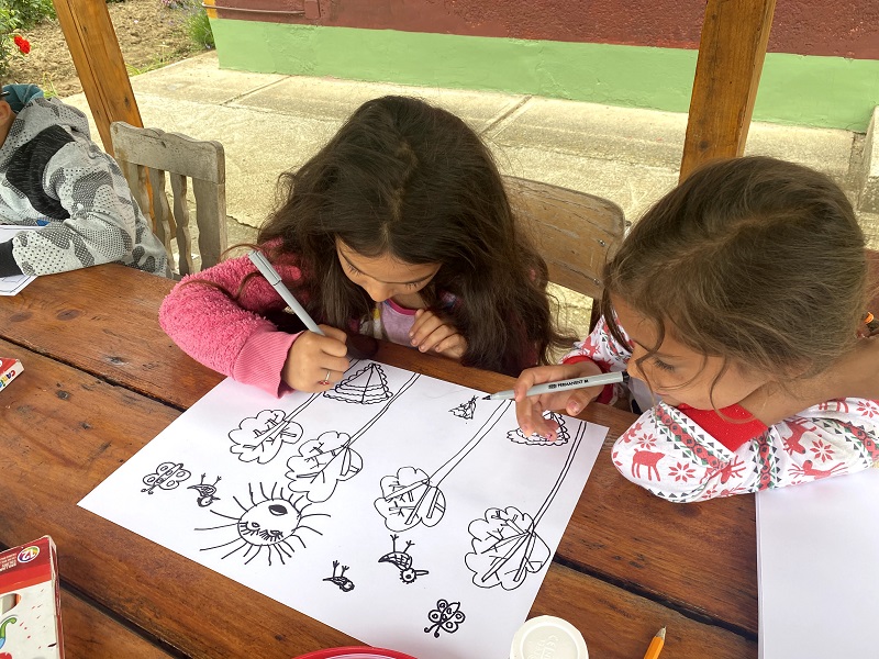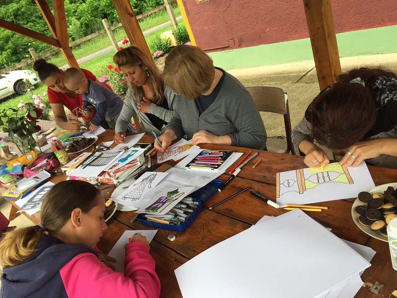 A munka három csoportban folyt a mesékhez igazodva. Az első csoportban a legkisebbek dolgoztak a másodikban a nagyobb gyerekek, a harmadikban pedig a felnőttek. A munkát megelőzően újra átolvastuk a meséket és összegyűjtöttük az egyes szereplőket, helyszíneket és a különféle kiegészítő elemeket. Elsőként a bábokkal foglalkoztunk, megbeszéltük hogyan is nézzenek ki, milyen ruhát viseljenek. Miután ezekkel elkészültünk a háttereket rajzoltuk, színeztük közösen, illetve elkészítettük a kiegészítő elemeket, kapukat, házakat, buszmegállót. Mindegyik csoport önfeledten és jó hangulatban alkotott, az elkészült alkotások pedig nyugodtan mondhatjuk, hogy önmagukért beszélnek. A mesék pedig a papírszínházban a gyerekek és felnőttek alkotásain keresztül, az ő kezük által válnak teljessé.