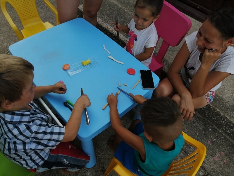 A kicsoportos ovis foglalkozás helyszínéül a Baba-mama klub rezidenciáját választottuk, ami utólag sok szempontból jó döntésnek bizonyult. Bár ezzel a korcsoporttal eddig még soha nem dolgoztunk a tanoda keretein belül, így még csak kísérletezünk, hogy megtaláljuk a program megfelelő kereteit, a gyerekeken ez nem érződött: mind a négy gyerek otthonosan mozgott a helyszínen, hiszen korábban mindannyian voltak a Baba-mama klubban anyukájukkal. Ezen az alkalmon négy állomást készítettünk elő a gyerekeknek: volt egy gyurmázós, egy homokozós, egy hintázós és egy meseolvasós. A gyerekek kedvük, motivációjuk szerint választhattak a tevékenységek közül. Bár amikor értük mentünk, néhányan kicsit megszeppenve szálltak be az autóba (egy kisfiút pedig csak az anyukájával együtt tudtunk elhozni), utána mindannyian nagyon felszabadultan játszottak.