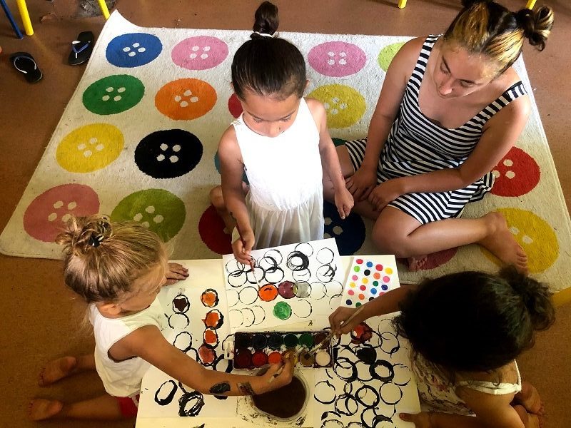 A leendő iskolaelőkészítősök számára ez az alkalom nem is annyira arról szólt, hogy barátkozzunk a hellyel és egymással, hiszen egy kisfiú kivételével nemcsak ovis klubba jártak már 6-7 hónapig a gyerekek, hanem az elmúlt években nem egy tábor alatt megfordultak a foglalkozásainkon. A hangsúly inkább azon volt, hogy egy-két olyan játékkal találkozzanak, amik évközben is előkerülnek, illetve, hogy mi kapjunk egy képet a feladattudatról, feladattartásról, eszközhasználatról, nyitottságról és picit az általános ismereteikről. Játszottunk színfogót, kiszabadultunk egy térkép segítségével a szőnyegről, gyűjtöttünk kislabdákat, majd a végén festettünk, maszatoltunk is egy kicsit.