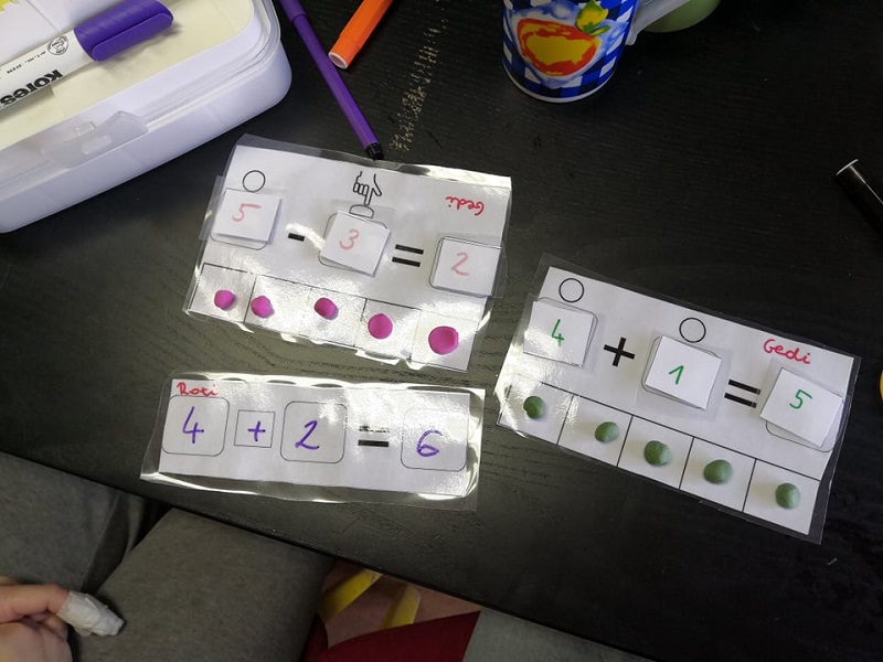 - A gyerekek kirakják a műveletet: összeadásnál gyurmagolyókat készítenek a két színből, míg kivonásnál kirakják a kisebbítendőt és szétnyomnak a kivonandónak megfelelő számú gyurmagolyót.