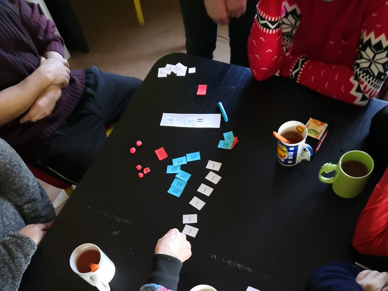 És hogy mik a tapasztalatok? Meglepően sok szülő vonódott be, az érintett tizenegy családból hét szülő rendszeresen eljött, a legtöbben legalább három alkalmon részt vettek. A dobozok egyben maradtak, az eszközök nem tűntek el rögtön, ami a kisebb tesók miatt pedig nem kis kihívás a hazavitt játékok esetén. Ugyanakkor többen használták is őket. Eltérő mértékben és rendszerességgel, de négy családban többször is játszottak vele, és érkeztek remek visszajelzések is. Az egyik apuka például viccesen panaszkodott, hogy az egyik nap késő estig játszottak a lányok a számkártyákkal, alig tudta elvenni tőlük és lefektetni őket. Egy anyuka pedig a sorozatkészítős alkalom elején a játéknál kérdezte meg, hogy nem ilyen feladat volt a múltkor a levelezős matekban is? Náluk egyébként pont ez a szülői klubos irány talált be: míg előtte csak néha jöttek vissza tőlük borítékok, a matekos alkalmak óta rendszeresen visszahozzák őket.