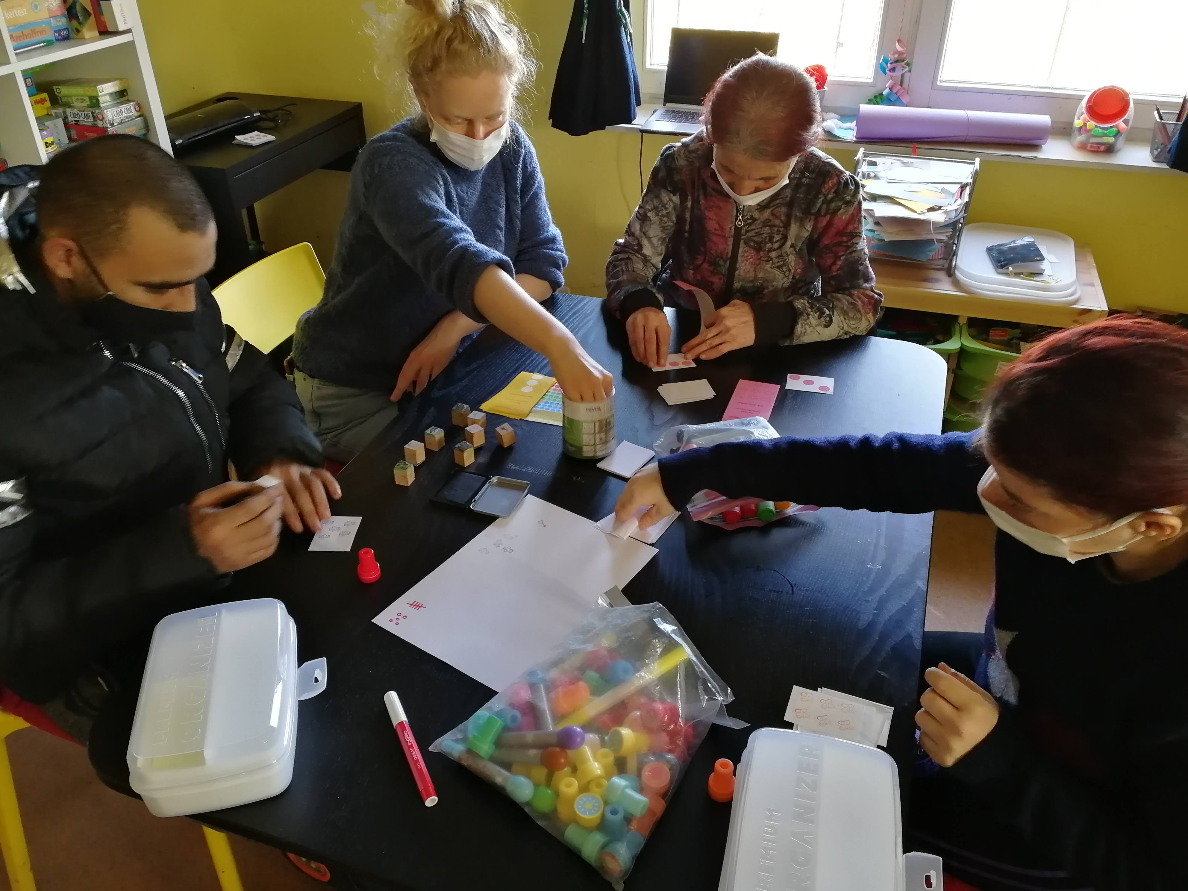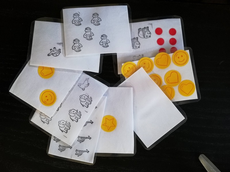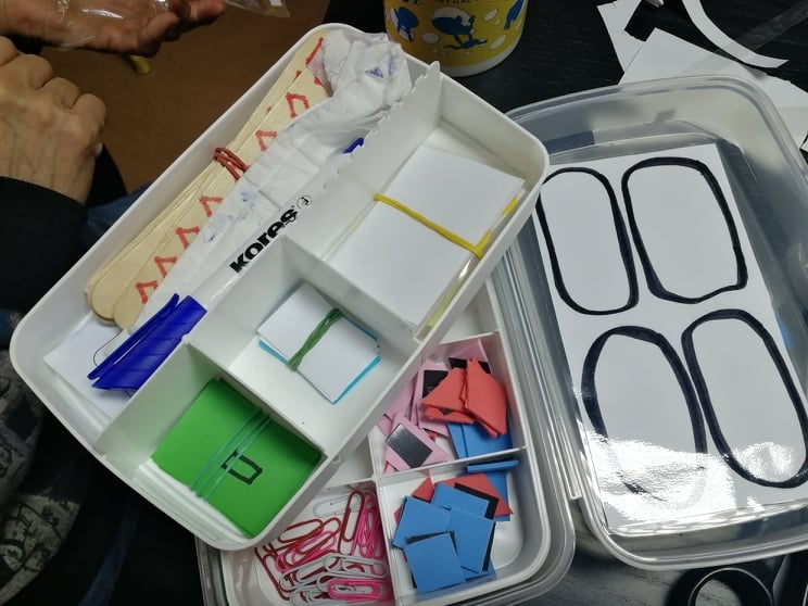 Minden alkalmat egy gyors játékkal kezdtünk, hogy az új eszközzel saját élménye is legyen a szülőknek, és persze azért is, mert ők is és mi is szeretünk játszani. Ezután következett az eszközkészítés, itt mindenki egy saját készletet vágott, rajzolt, ragasztott, csinosítgatott a gyerekeinek. Közben játékokon és feladatokon gondolkoztunk, és arról beszélgettünk, melyik gyereknek milyen számkör, alakzat vagy elrendezés lenne a legmegfelelőbb. Kidíszítettük a dobozt is, aminek az oldalai így minden alkalom után új, kitapogatható eszköz darabkákkal gazdagodtak. Az alkalom végén pedig egy-két szülő mindig maradt, hogy posztot írjon a Toldi asszonyok közössége facebook csoportjába az elkészített eszközről és a játékötletekről. Ezeket most itt is összegyűjtöttük.