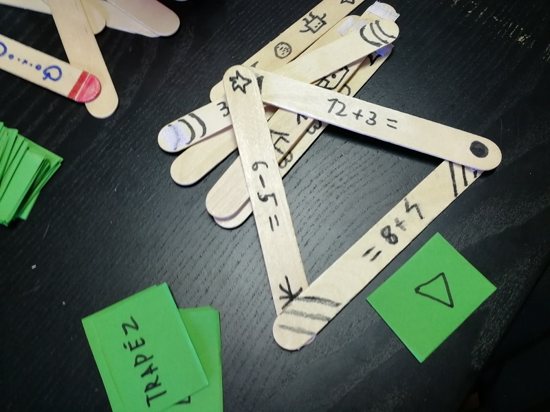 Elkészítés: Egy adag spatulát filcekkel kiszíneztünk, mintákkal díszítettünk – néhányan matekos feladatokat is írtak rájuk. A spatulák egy végét durva, a másikat puha tépőzárral láttuk el, így össze lehet őket tapasztani. Összegyűjtöttük, milyen sokszögeket ismerünk, ezek nevét és képét kis kártyákra felrajzoltuk.