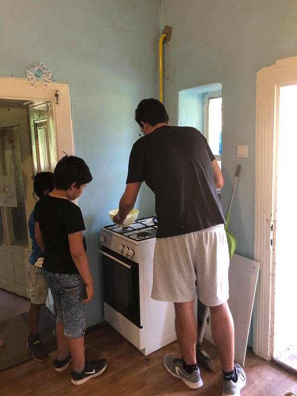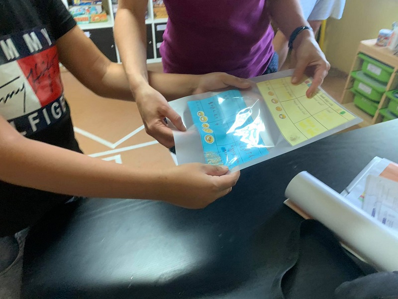 Ezután kevertünk és sütöttünk babacsintát (apró, banános palacsinta), és készültünk mogyorókrémmel és lekvárral is hozzá. A sütés és a falatozás meghozta a várt hangulatot és el tudtunk kezdeni beszélgetni az évről. Mindenki készíthetett magának egy kis emlékkártyát, amin szerepelt, hogy hányszor tanult velünk, hány önkéntessel és pedagógussal, mit szeretett a legjobban, mivel foglalkozott a legtöbbet. Mi is írtunk a lapra mindenkinek egy-egy szuper, közös emléket, végül pedig értékelhették az évet majd csicsázhatták a lapot. (Az például fontos tanulság számunkra, hogy a gyerekek csillámigénye nincs összhangban a laminálási technológiával.)