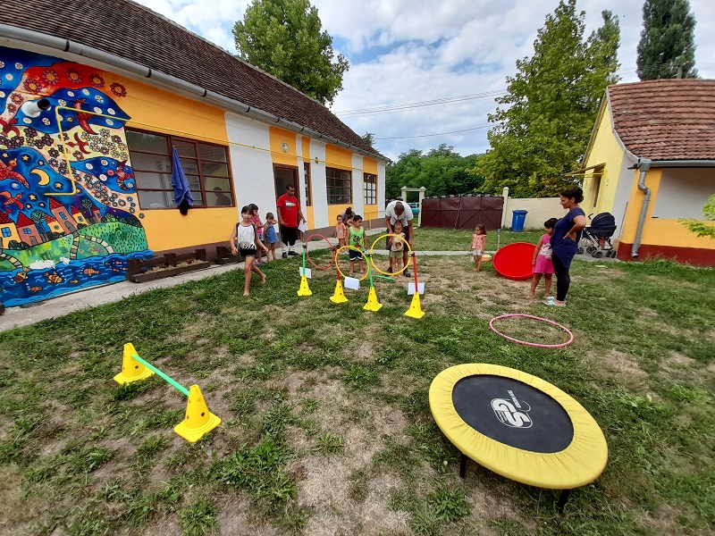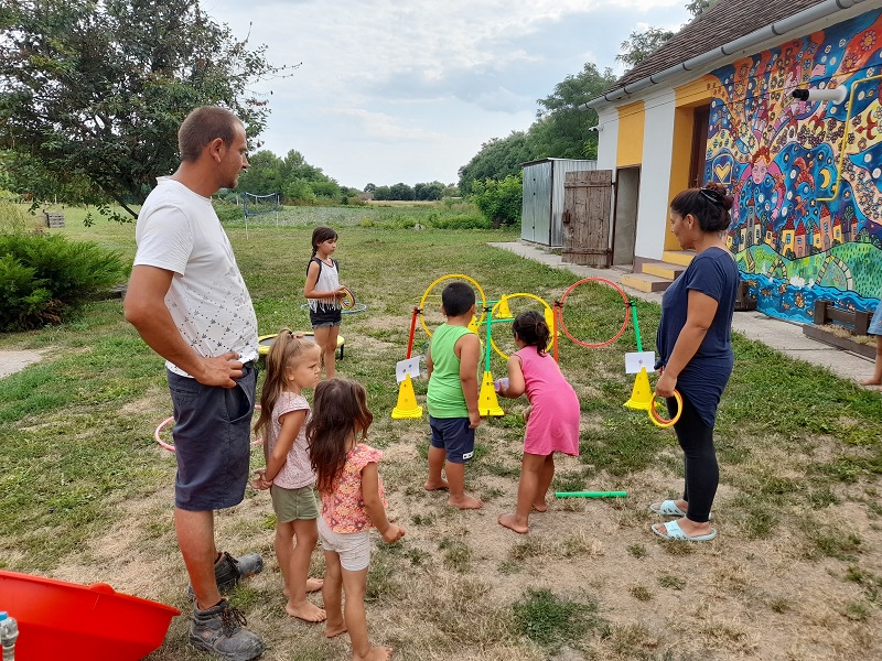 “A célbadobós akadálypálya ötletét egy képről vettem le, és úgy próbáltam felállítani a pályát, hogy hasonlítson rá. Valamennyit könnyítettem rajta, úgy próbáltam, hogy az óvodások könnyen tudjanak rajta végigmenni, és jól érezzék magukat közben. Először három pontozó karikán gumikarikákat kellett átdobálni, 1-3-ig lehetett pontokat gyűjteni. Másodjára átléptek két akadályt, utána volt két hullahopp karika, abba bele kellett állni, és magukon áttenni a szülő segítségével. Kis szaladás után egy trambulinra kellett ráugrani és arról beleugrani egy hullahopp karika közepébe. Nehezítésként volt a kezükben egy vízilufi, amit a pálya végén kellett kipukkantani egy nagy piros tölcsérben.” (Zsiga)