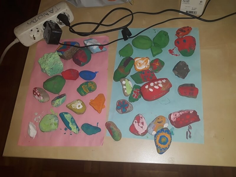 Az első kézművesen a faluban talált köveket festettük meg. A gyerekek közül páran teljesen új mintát találtak, páran pedig régebbi mintákat festettek meg. A foglalkozást nagyon élvezték, jó sok festék került mindenhová.
