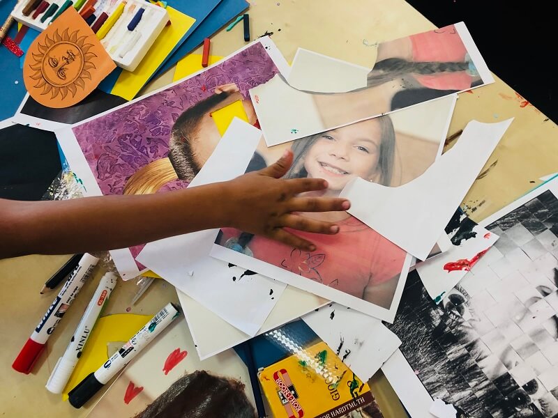 Óriási újdonság volt a kreatív portré készítés montázs technikával. Ez a foglalkozás több szempontból lehetett izgalmas és fejlesztő jellegű a gyerekek számára. Miután egyenként lefotóztuk őket, majd kinyomtattuk a portrékat, saját arcukkal, illetve egymás arcával dolgozhattak. Ezek a képek szolgáltak a kézműves alapjául. Innentől kezdve minden a kicsik fantáziájára volt bízva. Közös arcképet készíthettek; megmutathatták hogyan látják önmagunkat és egymást, s így tovább. Mindenki nagyon kreatívan és különlegesen oldotta meg a gyakorlatot, és ami a legfontosabb, hogy hatalmas kacaj kísérte az egész folyamatot.