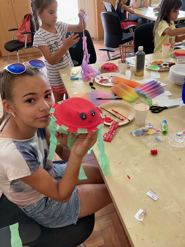 Sok-sok szuper polipkalap készült a csütörtöki kézműves foglalkozáson. Többen nagyon elmélyülten dolgoztak, és jó volt látni azt is, hogy mindenki a fantáziája szerint alakítja a fejfedőjét. Volt dinnyepolip, pillangós polip, meg mindenféle színes csoda. Aztán persze felvilágosítottak a skacok, hogy ezeket inkább medúzának kellene hívni.