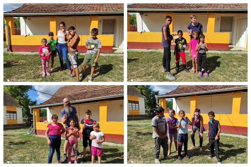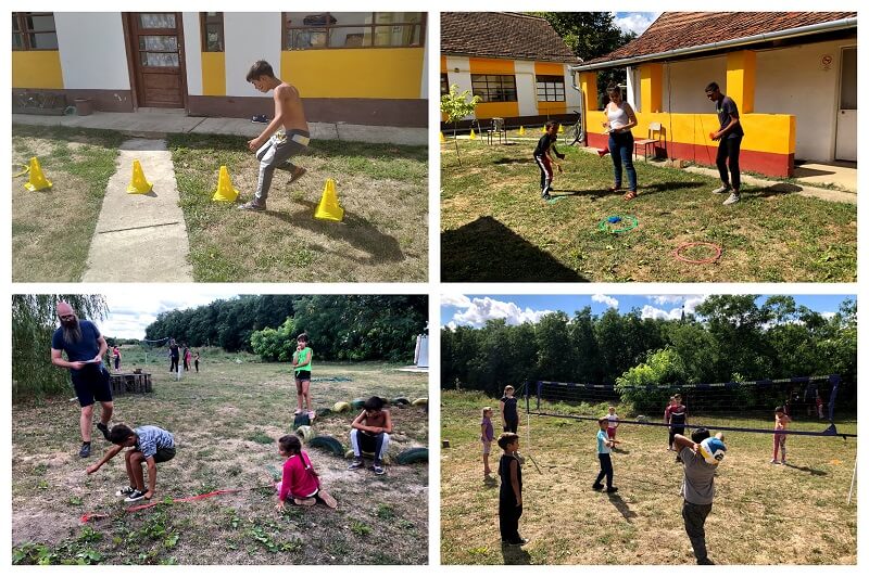 Délután találkoztunk újra a gyerekekkel, ezúttal a helyszín a tanoda kertje volt. Itt először edzéseken vettek részt a sportolók, ahol megismerhették a versenyszámokat, majd élesben is kipróbálhatták magukat akadályfutásban, célbadobásban, távolugrásban, valamint zsinórlabdában.