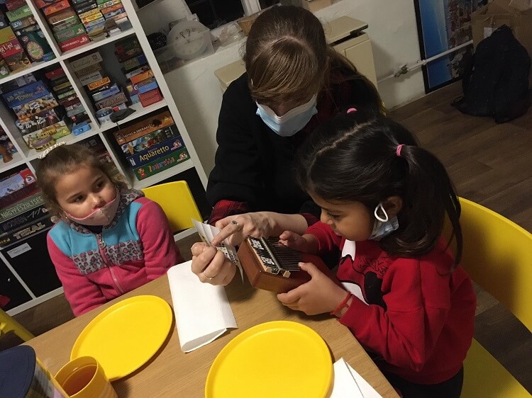 A finomság sem maradhatott el a karácsonyi mókázásból. A gyerekek bundás almát készítettek. A bundához való hozzávalókat ők mérték ki és kavarták össze a segítségünkkel és az almaszeletek felvágásába is beszálltak. Végül bő olajban kisütöttük a bemártott almaszeleteket. Amíg az almaszeletek sültek, addig a gyerekek szépen megterítettek és egy kis zenélés következett, egy igen kellemes hangú hangszeren, a kalimbán. Először a tanodapedagógusok játszottak el egy-egy karácsonyi dalt és közben a gyerekek dalra fakadtak és énekelték a jól ismert karácsonyi dallamokat pl.: a Kiskarácsony, Nagykarácsonyt és a Mennyből az angyal c. dalt. Közben persze az almaszeletek is elkészültek és a gyerekek jóízűen fogyasztották el az ízletes falatokat. Az evés után a kalimbát is kipróbálhatták a bátor vállalkozók és színkotta alapján megpróbálhatták eljátszani a Mennyből az angyalt. Egyes gyerekeket nagyon elragadott a kalimba hangja és a külvilágot kizárva teljes flow élményben próbálgatták a dallamok lejátszását. Ezzel párhuzamosan vicces karácsonyi filterekkel egy kis fotózkodás is folyt.