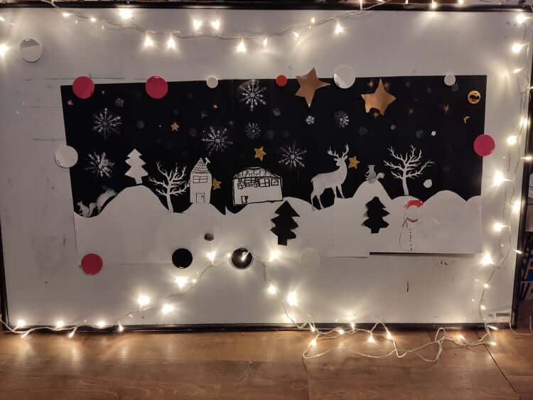 A tanodában is elérkezett az a várva várt időszak, amikor a karácsonyra hangolódás állt a középpontban. Ahhoz, hogy izgalmasan teljen ez a hét sok érdekes feladattal készültünk a gyerekek számára. Először is célként tűztük ki, hogy hétvégére elkészüljön egy tabló, amely egy havas tájat ábrázol. Ennek az elkészítésében a tanodába járó nagycsoportos korosztálytól egészen középiskoláig minden gyermek részt vett. A feladatok különbözőek voltak korosztályonként. A legnagyobbak kivágtak egy-egy fát vagy állatot és ezeket utána lefújták hóspray-vel és felhelyezték őket a tablóra. A felsősök és pár nagyobb alsós hópehely sablon segítségével hópelyheket fújt a tablóra. A többi alsós egy-egy ház, hóember, csillag, havas domb, rajzolásával és kivágásával, végül azok bluetech-kel való felragasztásával járultak hozzá a tabló elkészüléséhez. A legkisebbek pedig hópelyhek pecsételésével szépítették a havas tájat.