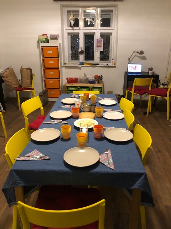 A felsősökre és a középiskolásokra egy kicsit más program várt, bár már arról írtunk korábban, hogy a közös tabló elkészítéséből ők sem maradhattak ki. A nagyokra karácsonyi vacsora várt egy szépen megterített asztallal. Azért, hogy jobban karácsonyi hangulatot varázsoljunk a tanodába egy pár fényfüzérrel díszítettük fel a tanoda nagy szobáját és itt is felcsendültek a jól ismert karácsonyi dallamok. A vacsora kellemes meghitt beszélgetéssel zárult.