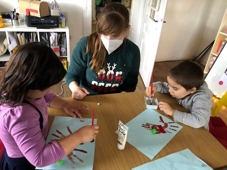 Ezt követően még egy kézműves darab elkészítése következett. A munka alatt jól ismert karácsonyi dalokat hallgattunk, hogy jobban menjen a munka. Az ovisok a kezüket befestve, lenyomatot hagyva a papíron, a Mikulás híres  rénszarvasát Rudolfot mintáztak. Majd orrot ragasztottak neki pom-pom-ból, végül szemet is. A  rénszarvas körül pedig ujjlenyomatokat hagyva hullt a hó.