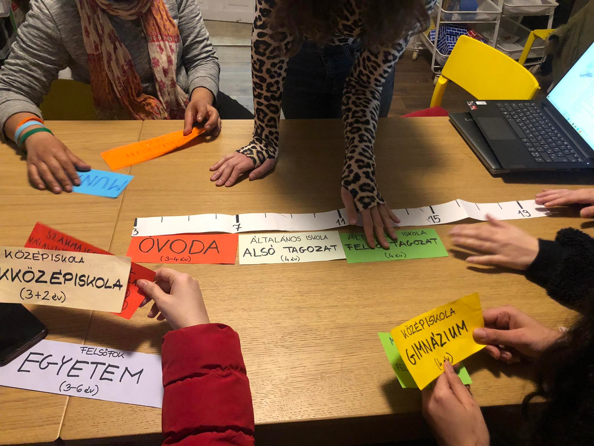 Persze a mostani nagyoknak is volt program a projekthéten: több témával, jobban elmélyülve. A brainstorming során például velük arról is beszélgettünk, hogy melyik szakmát lehet a közelben tanulni, illetve milyen iskolai végzettség kell egy-egy szakma elvégzéséhez. De volt két olyan pont is, amit a kisebbekkel még egyáltalán nem akartunk boncolgatni, ez a bruttó és nettó fizetés kérdése, valamint a bejelentett és fekete munka közti különbség volt. Mivel tavaly és közeljövőben is lesz lehetőségük az Alapítványnál diákmunkát végezni, ezért kicsit a nálunk végezhető tevékenységekről is beszélgettünk két igaz, egy hamis állítások mentén. Az alkalmat pedig azzal zártuk, hogy kiraktuk az iskolai tanulmányok idővonalát és megnéztük, hogy ki hol áll jelenleg, valamint, hogy milyen lehetőségei lesznek az elkövetkező években.