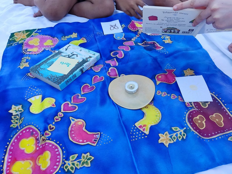 Az ötlet egyszerű volt: amikor véget érnek a tábori programok, felkerekedünk néhányan és elsétálunk pár családhoz, ahol mesélünk egyet a szülőkkel együtt. A már jól ismert és megszokott keretet sem felejtettük el persze, a rituálé most a mesélős hely kialakításával kezdődött, ezután jött a szokásos gyertyagyújtós, mondókás ráhangolódás, a mese után pedig a gyertya elfújása. Ehhez összeállítottunk egy pici csomagot, igazgyöngyös mesekendővel, mécsessel, mondókás kártyákkal, amit az első alkalmakon odaadtunk a családoknak. Vittünk két mesekönyvet is, hogy mindig legyen választás. Ezekkel egyébként nem titkolt célunk volt az is, hogy akinek van kedve, a két tábor közti időszakra kikölcsönözheti az egyiket, így a szünetben is mehet a mesélés otthon, nélkülünk is.