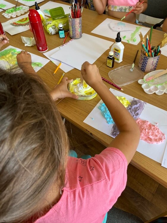Mire nem jó egy kis borotvahab, ragasztó és ételfesték? Először is nagyon jó őket összekeverni, így mi magunk készítettük el a kézműveshez használt festéket. Másodszor a borotvahabnak köszönhetően igazán pufi alkotások születtek szívecskétől a lufin át mindenféle pufis állatig.