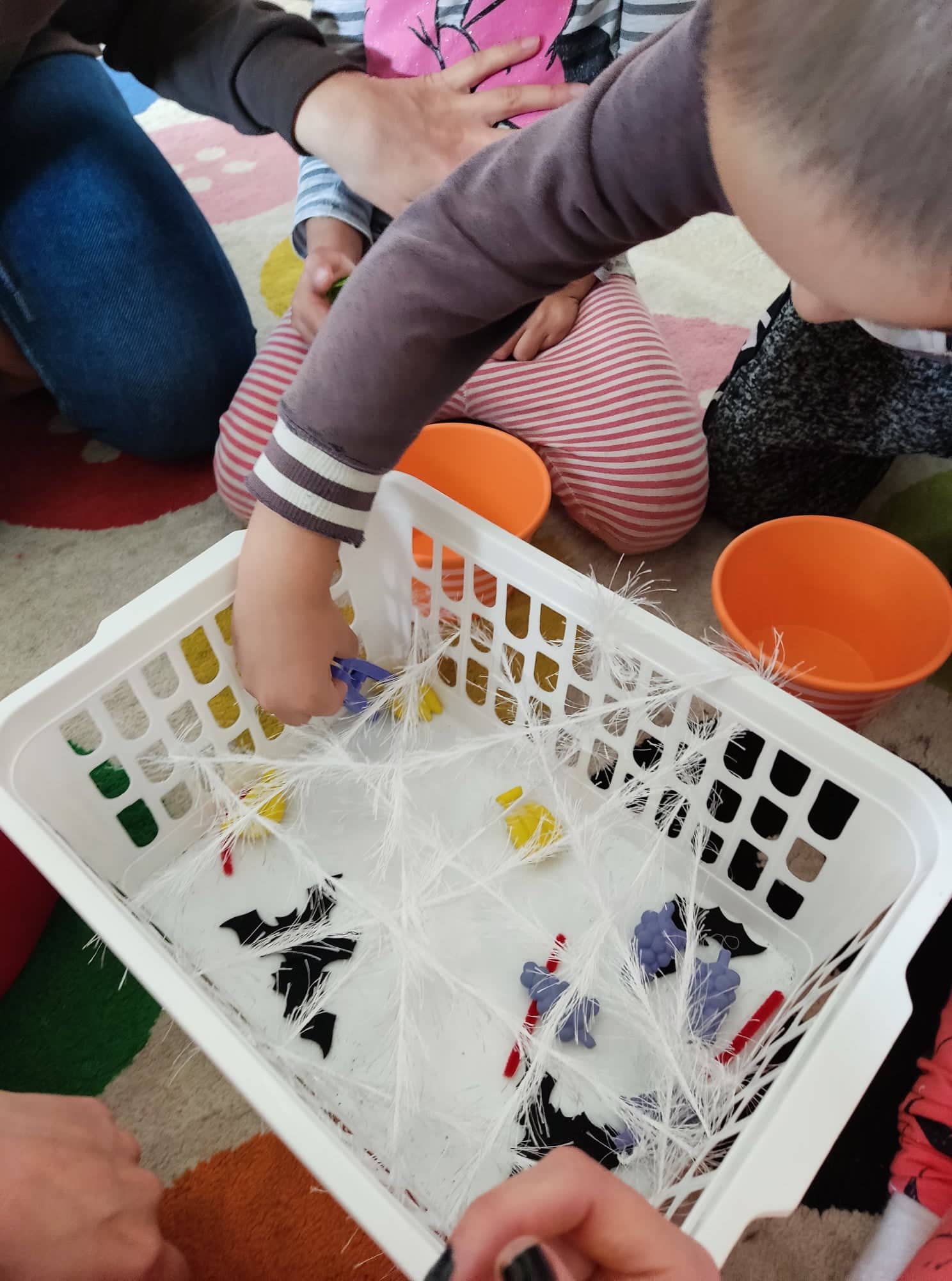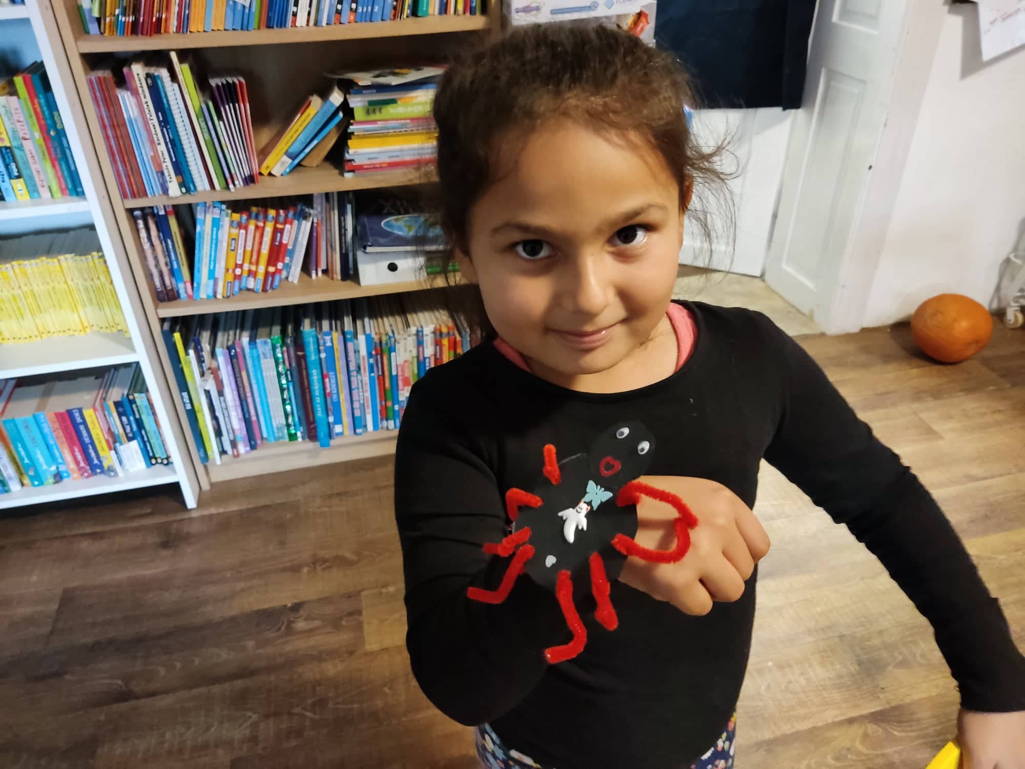 A kiscsoportban, egyéni tanulásra érkezőket az órarendnek megfelelően fogadtuk. Ráhangolódásként, megérkezésként szellemes, tökös, koponyás Tic Tac Toe partik pörögtek majd jöhetett az első kihívás, ami a hallott szöveg értésére épült, mert bizony itt még a tanulás is szerepet kapott. Szellemek meséltek rímekben, a gyerekeknek pedig döntéseket kellett hozniuk, varázsfőzet hozzávalókat kellett megjegyezniük, hogy megtalálják az elátkozott tanoda kulcsát. Ezután boszorkányos matek következett, ahol bizony csupa olyan dolgot számolgattunk – szemek, körmök stb. -, amiket hétköznap nem szokás. A lezárás pedig egy közös, pókos kézműveskedés volt.