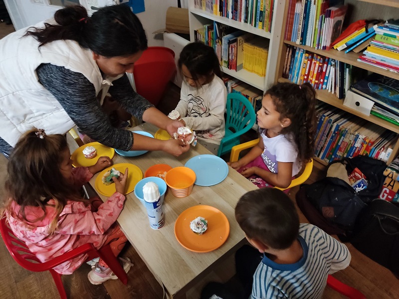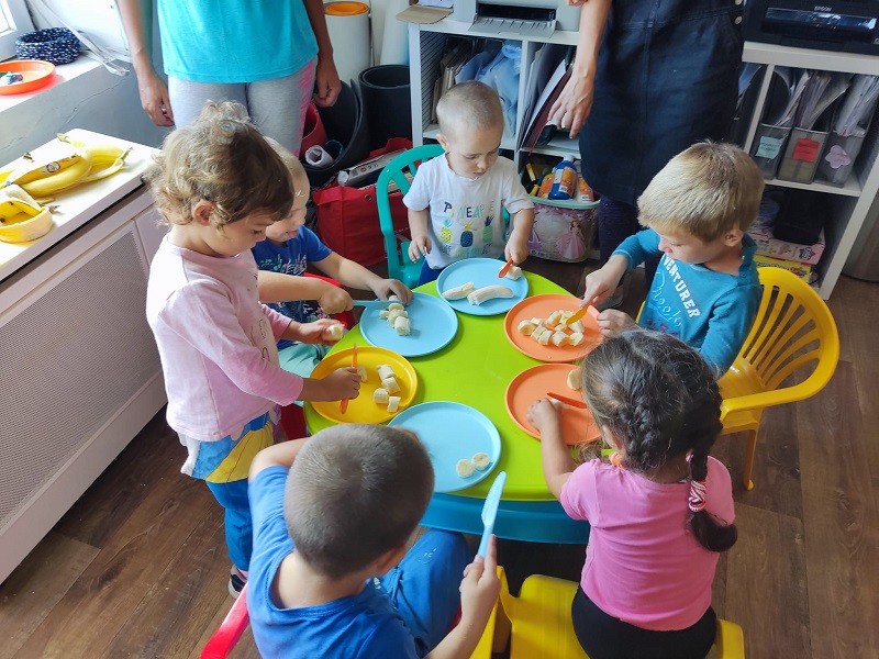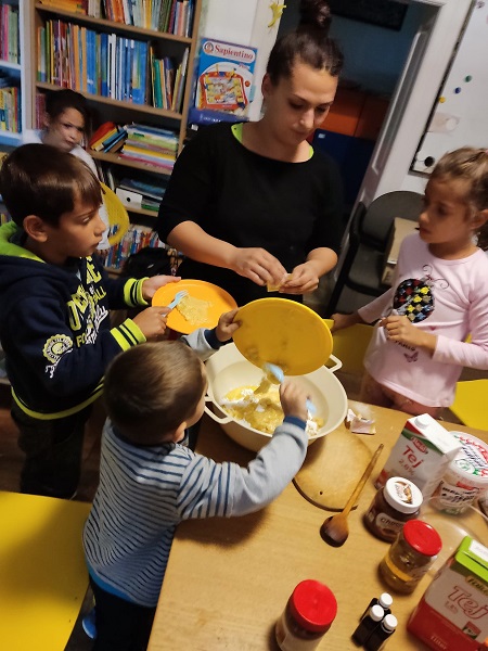 “Ahogy vége volt a játéknak, átmentünk a következő helyiségbe, ott a gyerekek segítettek a gyümölcsöket felvagdalni. Gyümölcsturmixot készítettünk, egy felnőtt turmixolt. A gyerekek öntötték szét, a cukorkát is a nagy gyerekek szórták rá nekik a tetejére. Ízlett nekik nagyon, újdonság volt sok gyereknek, elfogyasztották az egészet.” (Kinga)