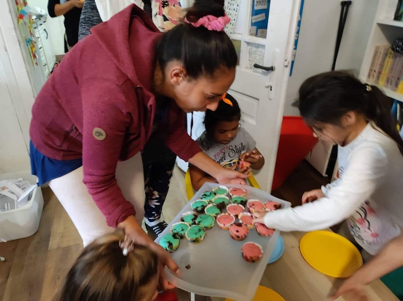 “Úgy gondolom, jó kis délután volt, voltunk jópáran szülők és gyerekek. Muffin sütéssel és régi fotók nézegetésével telt a délután, a muffinsütés és a fotónézegetés is én ötletem volt, amit aztán Beával megbeszéltünk és neki is tetszett ez az ötlet, így maradtunk ennél a két programnál. Bea volt, aki összeállította a muffin tésztáját, én pedig a díszítésben segítettem, ami abból állt, hogy a kihűlt muffinok tetejére tejszínhabot és ízlés szerint minden gyerek színes cukorkát szórhatot. Amit persze ők maguk csináltak. Amíg sült a muffin, addig nézegettünk mindannyian régi fotókat a gyermekeinkről, ami szerintem nagyon tetszett mindenkinek. Közben mi Beával néztük a muffinokat, ami még sült.” (Brigi)